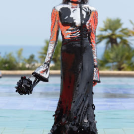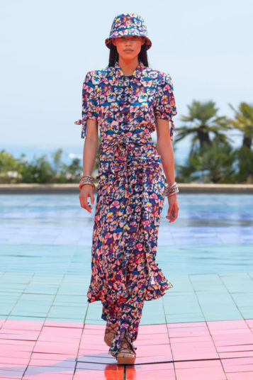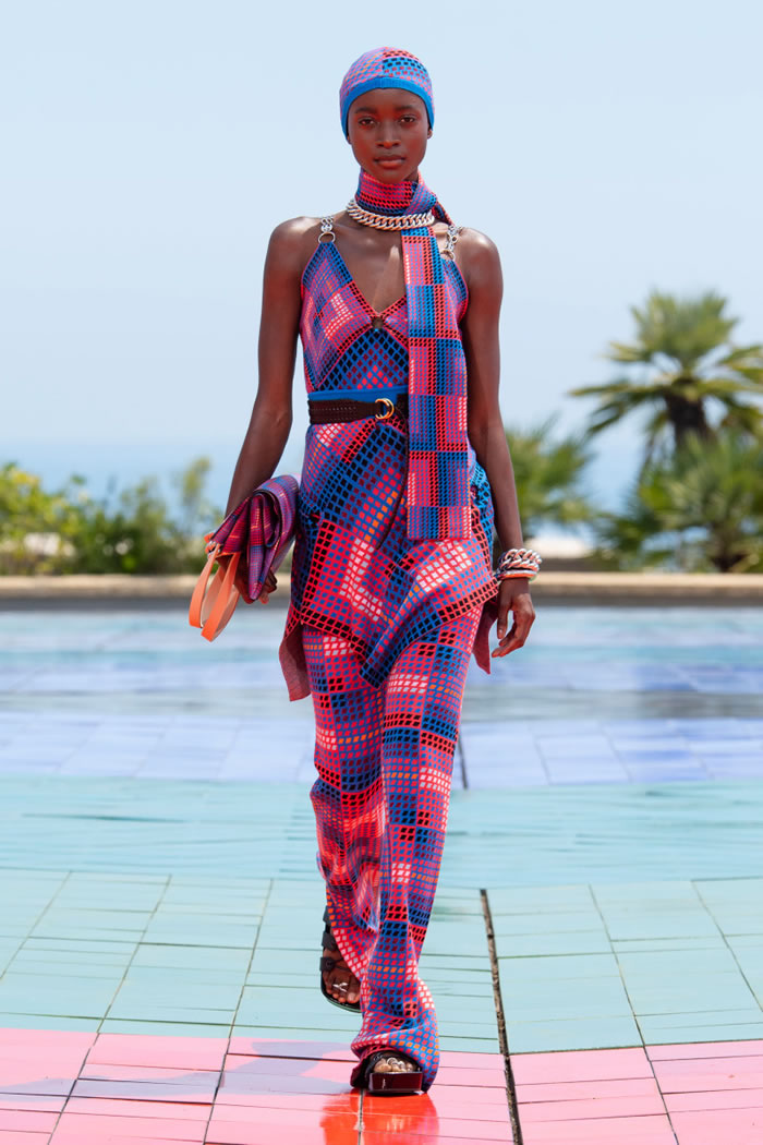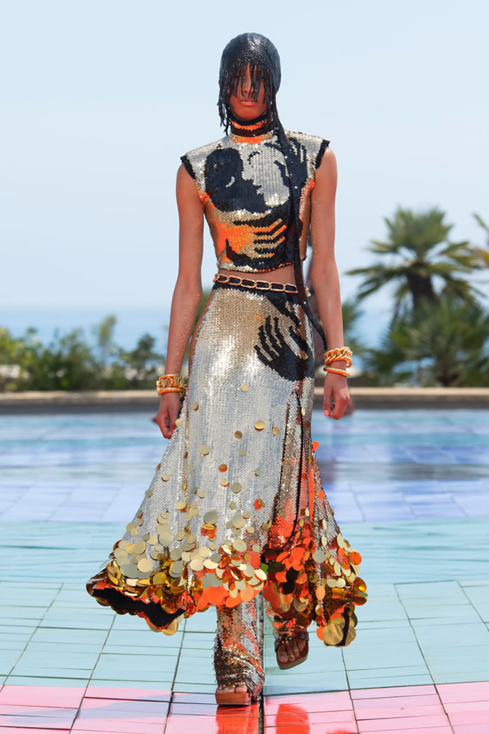 Vasarely’s patterns abounded, applied in all colors and textures — knits, jacquards, jerseys, laser printed, and even drawn out with sequins. Models crisscrossed the vast seaside runway, following the lines of the colorful tiles under their feet — another work from Vasarely, called “Hexa Grace.”