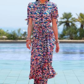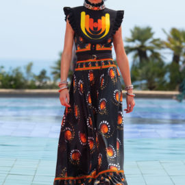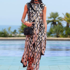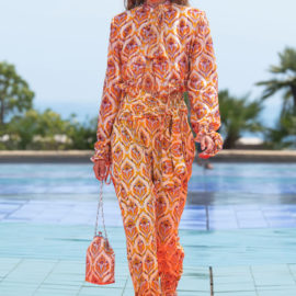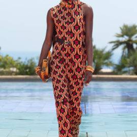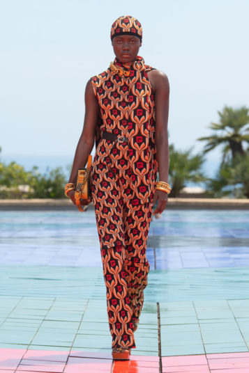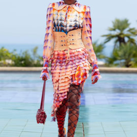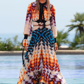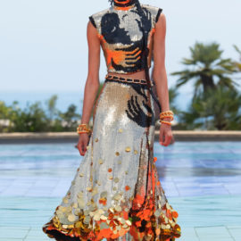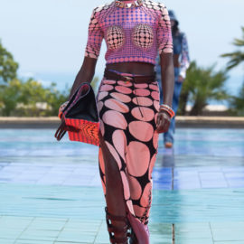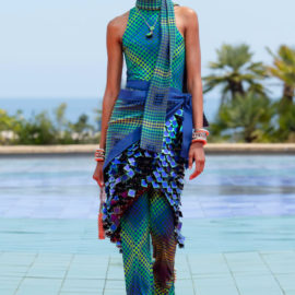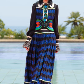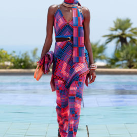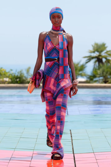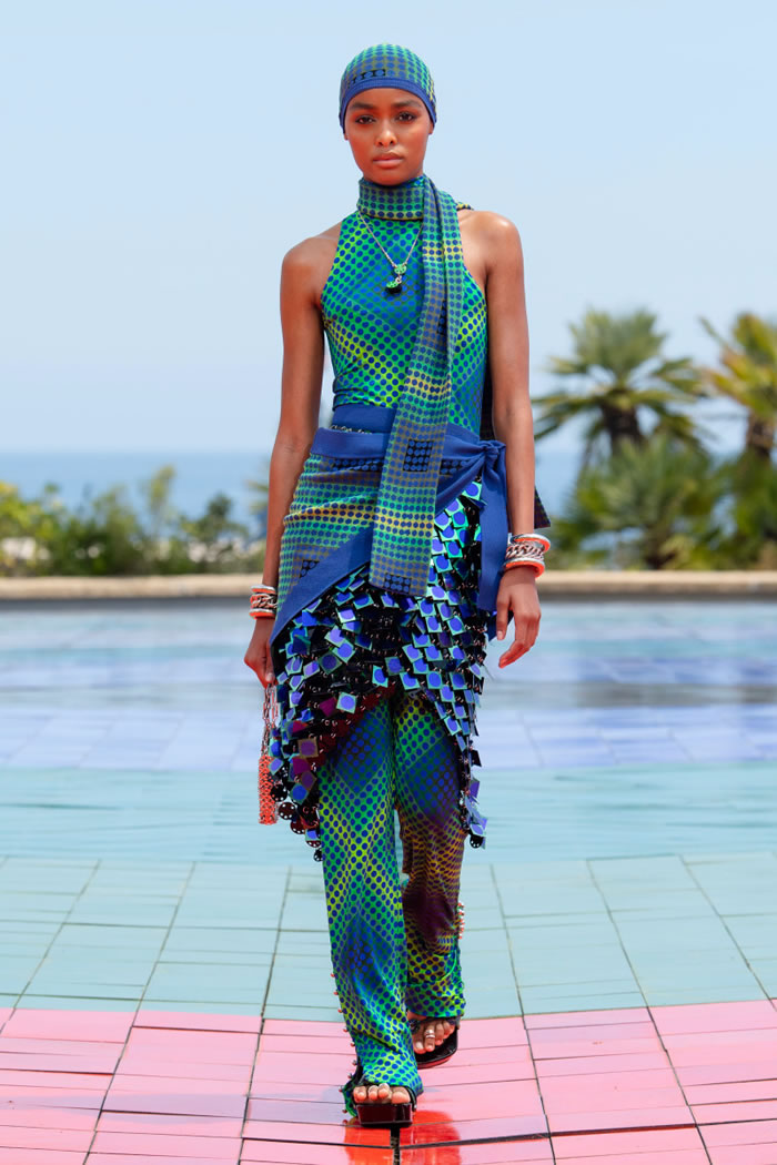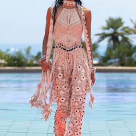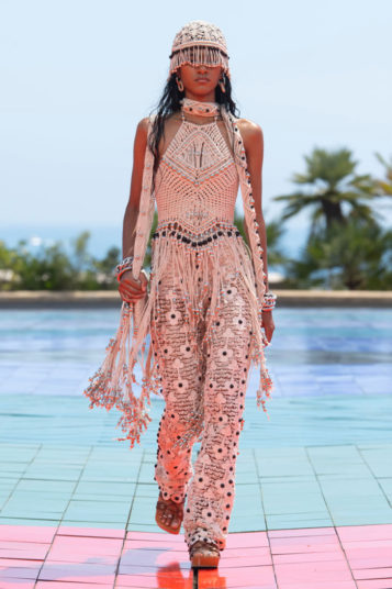 Toggling between body-covering and skin-baring looks, he piled on the layers — clothing, and accessories. Tunics and dresses were tossed over trousers and harem pants, then came the chunky bracelets, mesh scarves, waistbands covered in oversize eyelets, and chain belts. That is not to say he didn’t offer skimpy, too — an eye-popping pattern of circles in blue, turquoise, and yellow was worked into a short skirt and bra top, a motif that called to mind the stretchy Jean Paul Gaultier dress worn by Kim Kardashian West last year. Contrasting with the circles, Dossena added sandals with lacework that crawled up the leg. Another look was woven together in macramé and embellished with silver beads, Ibiza hippy style.