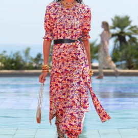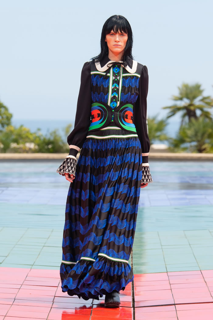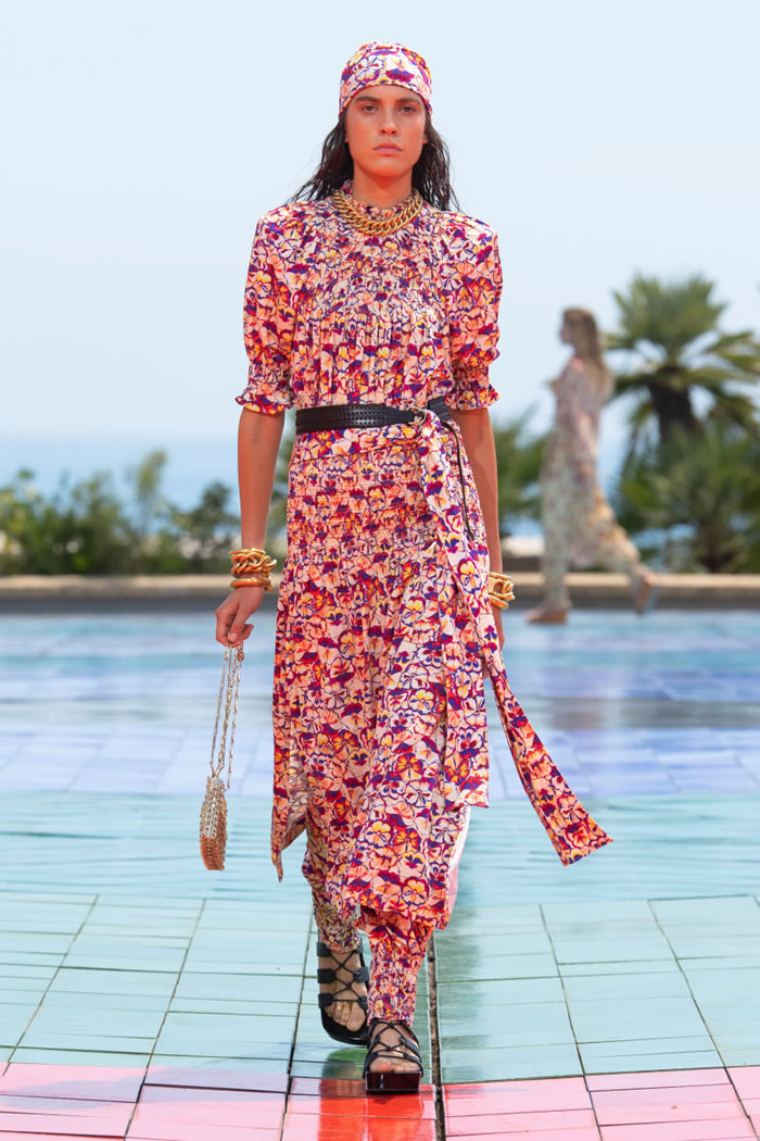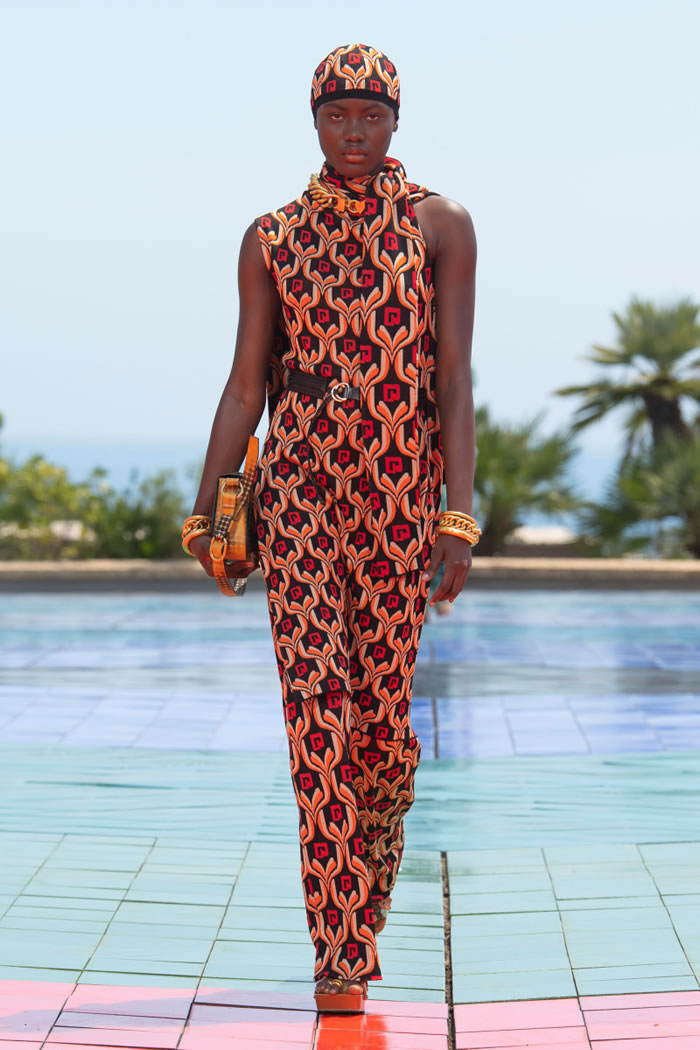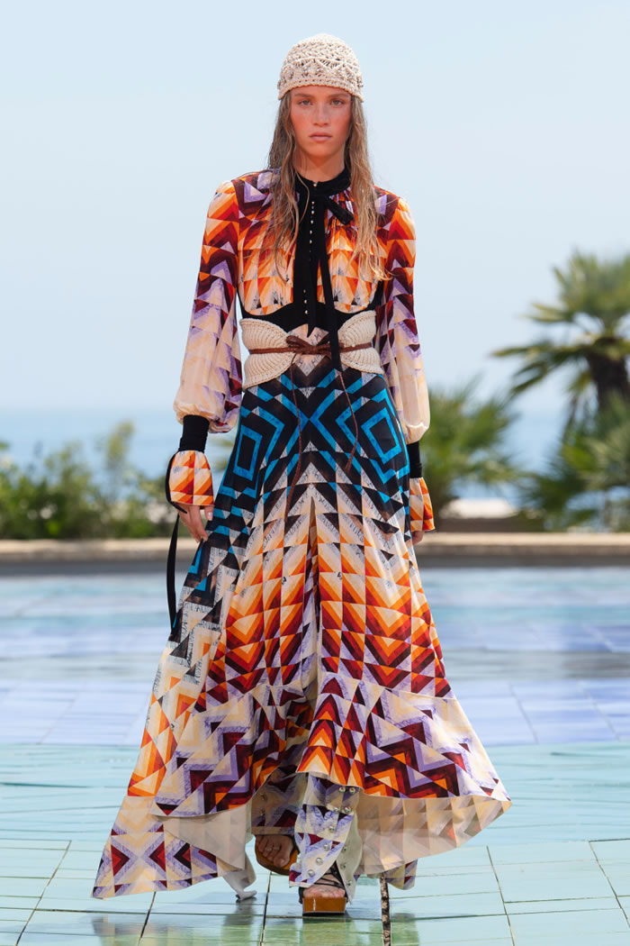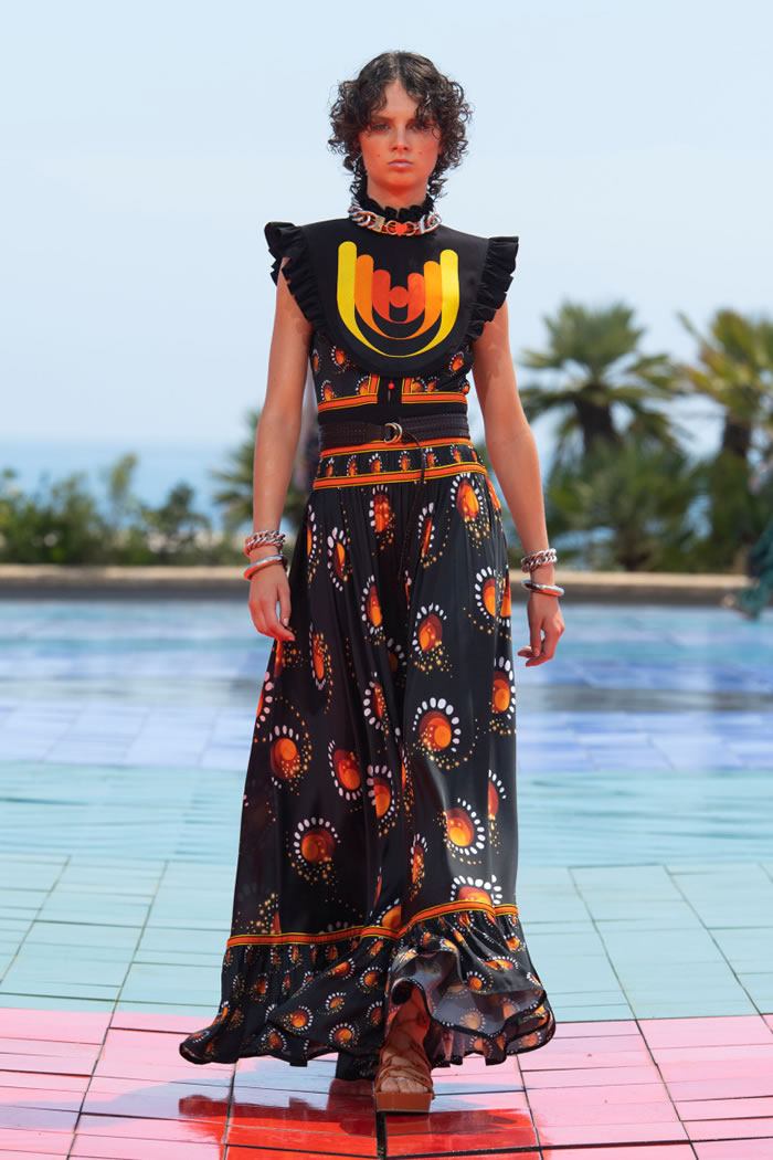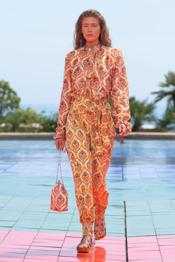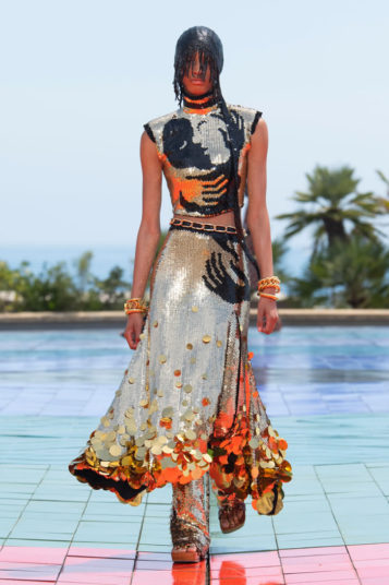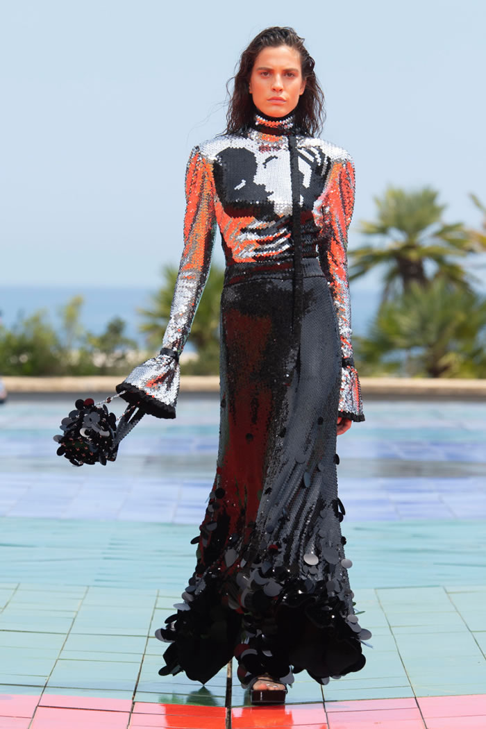 For spring, Julien Dossena whisked his audience off to Monaco — through the screen — sending his 1960s- and ’70s-flavored lineup down a sun-kissed rooftop runway that overlooked the Mediterranean. It was both glamorous and groovy, drawing on Op Art from Victor Vasarely, which added geometric patterns to the elongated silhouettes that shimmered in the bright light.