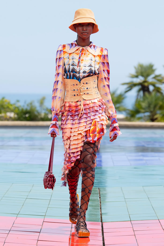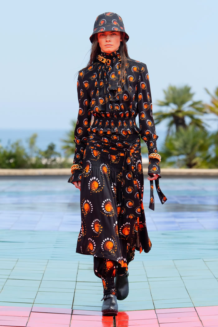 Topping off the looks were tasseled caps, bucket hats, and scarves, sometimes with fringes covering the face. And he plucked clogs and chunky sandals from the archives, brushing them up for a contemporary audience.