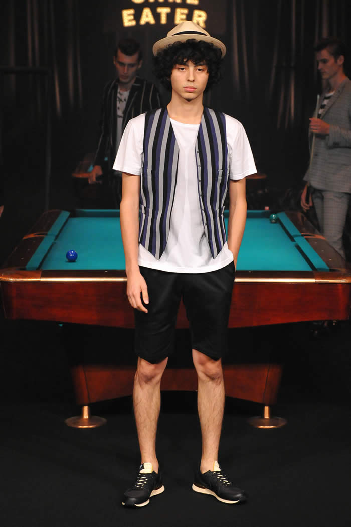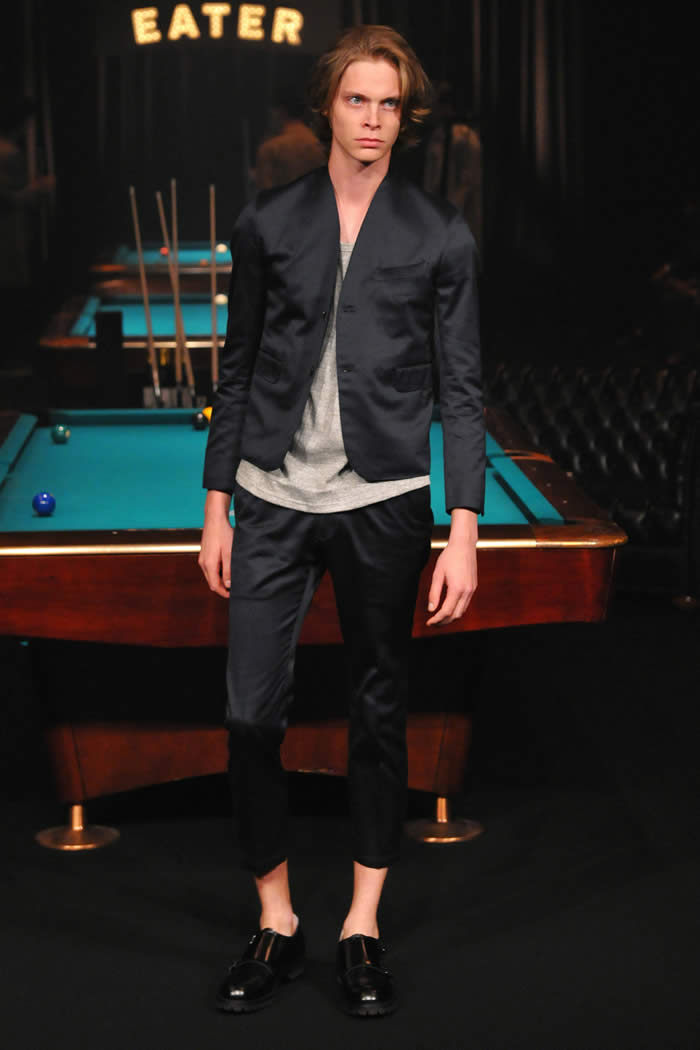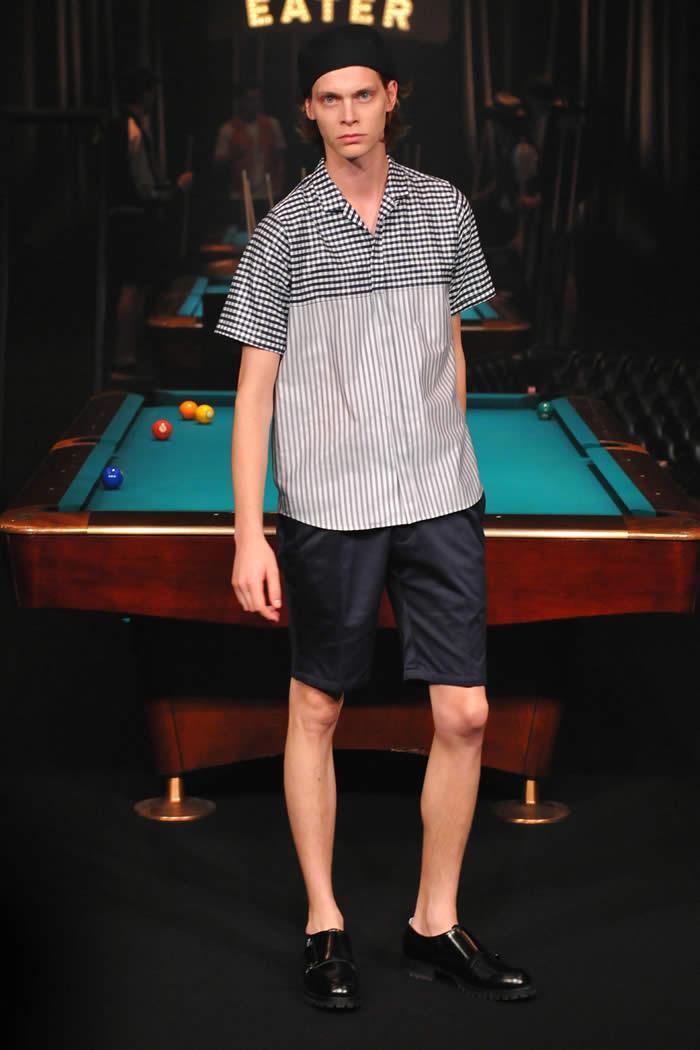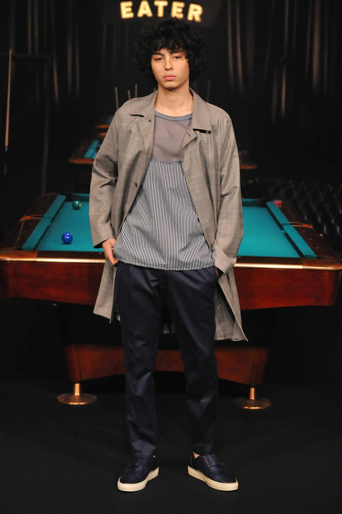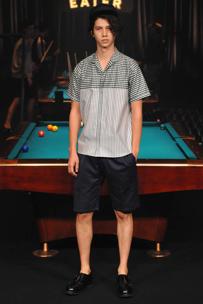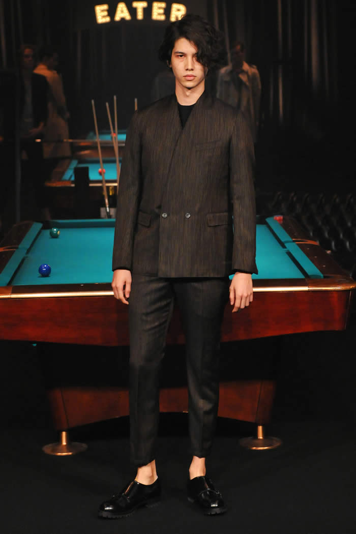 Billiard tables, leather sofas and bottled beer dotted Shigeki Morino’s spring runway, creating a setting reminiscent of a private club. Once the show started, models played pool in small groups before taking their leave one by one to pose for the cameras wearing the designer’s latest Patchy Cake Eater men’s collection. It was a unique and interesting staging choice, but the dim lighting made for somewhat difficult viewing of the pieces. What was obvious: The lineup in sync with the set  veered toward cool via a series of tailored yet relaxed suits and separates.