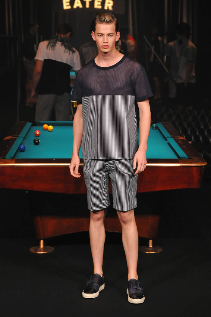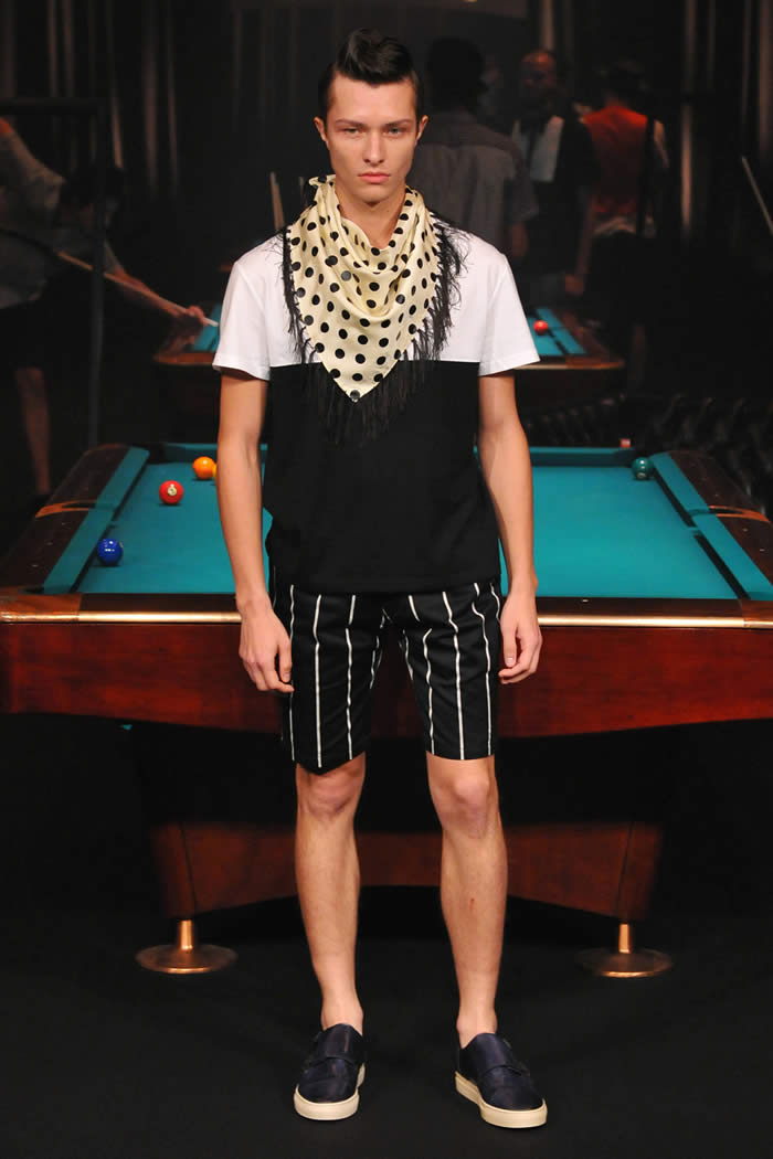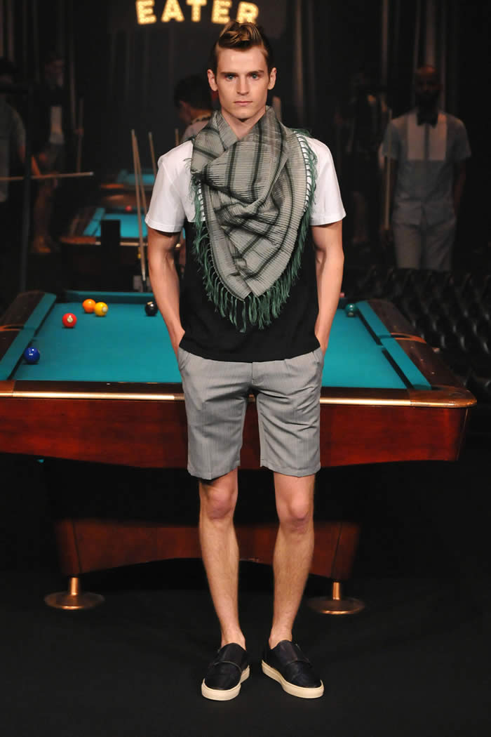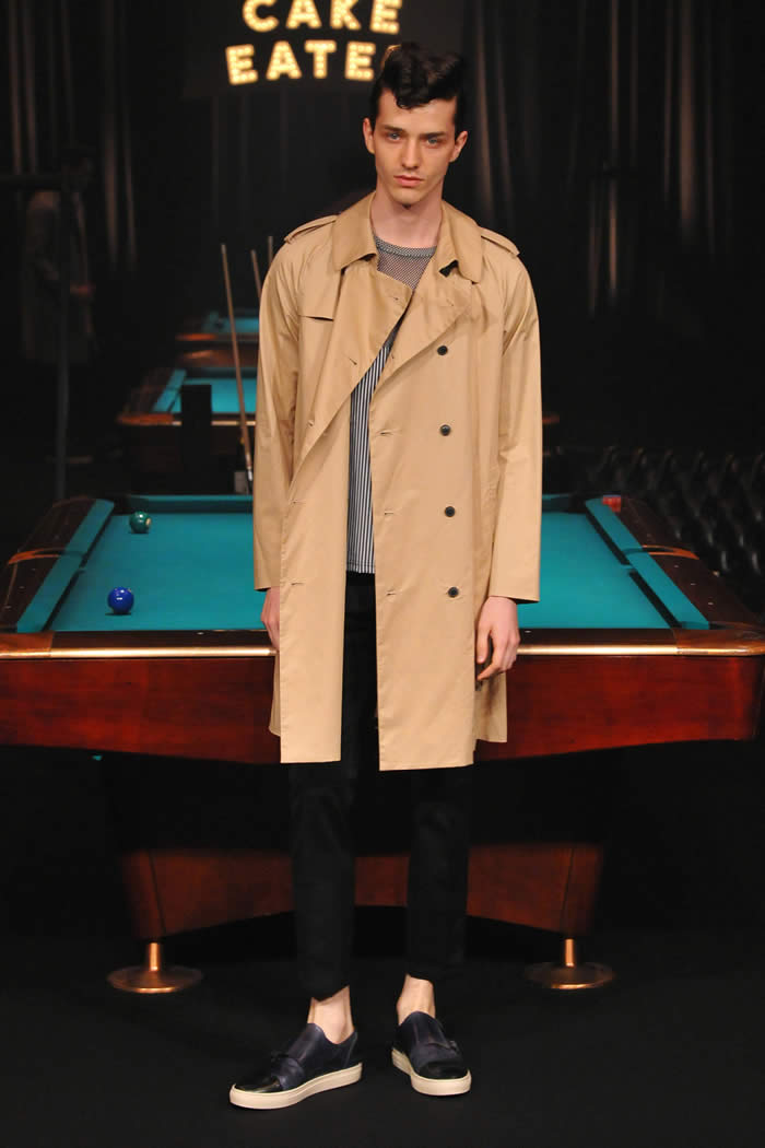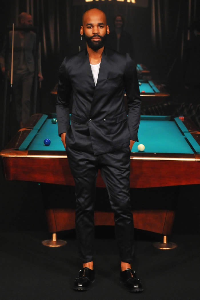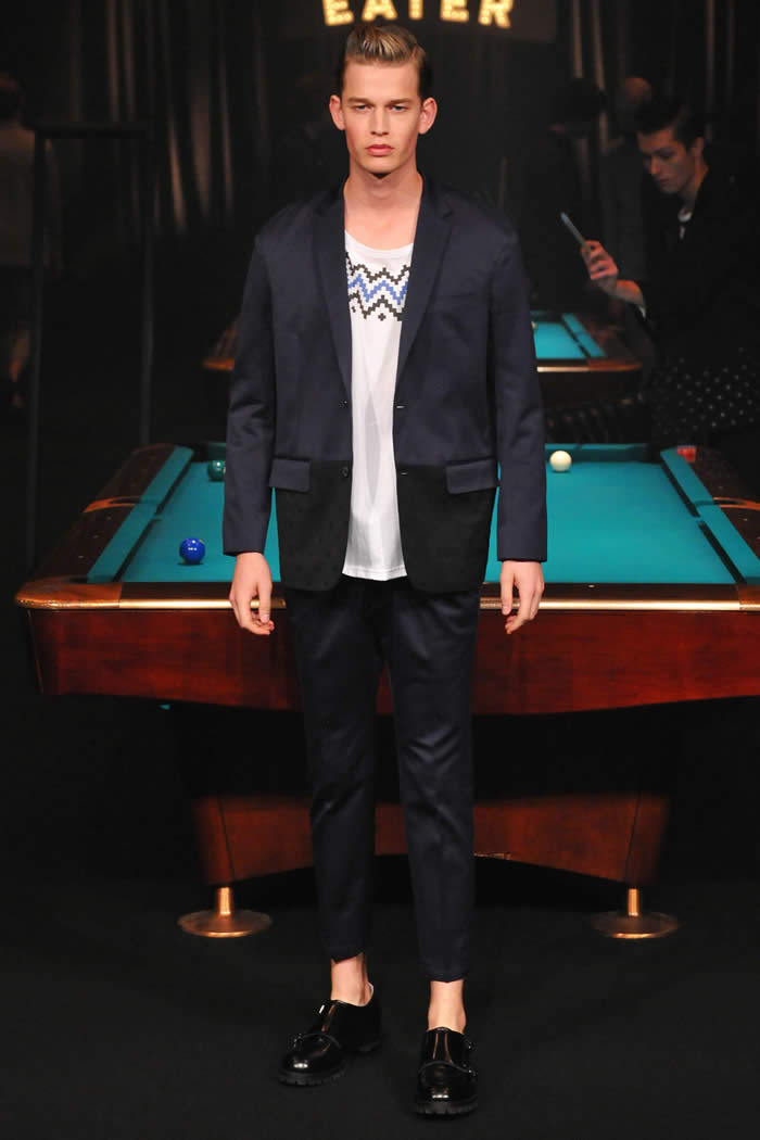 Billiard tables, leather sofas and bottled beer dotted Shigeki Morino’s spring runway, creating a setting reminiscent of a private club. Once the show started, models played pool in small groups before taking their leave one by one to pose for the cameras wearing the designer’s latest Patchy Cake Eater men’s collection. It was a unique and interesting staging choice, but the dim lighting made for somewhat difficult viewing of the pieces. What was obvious: The lineup in sync with the set  veered toward cool via a series of tailored yet relaxed suits and separates.