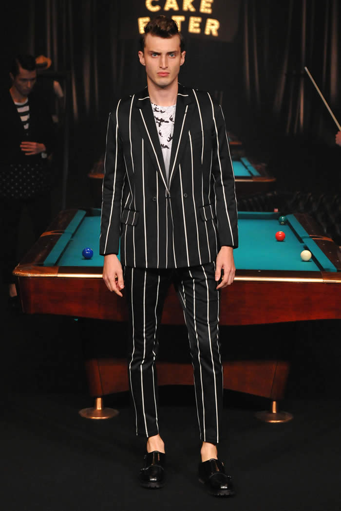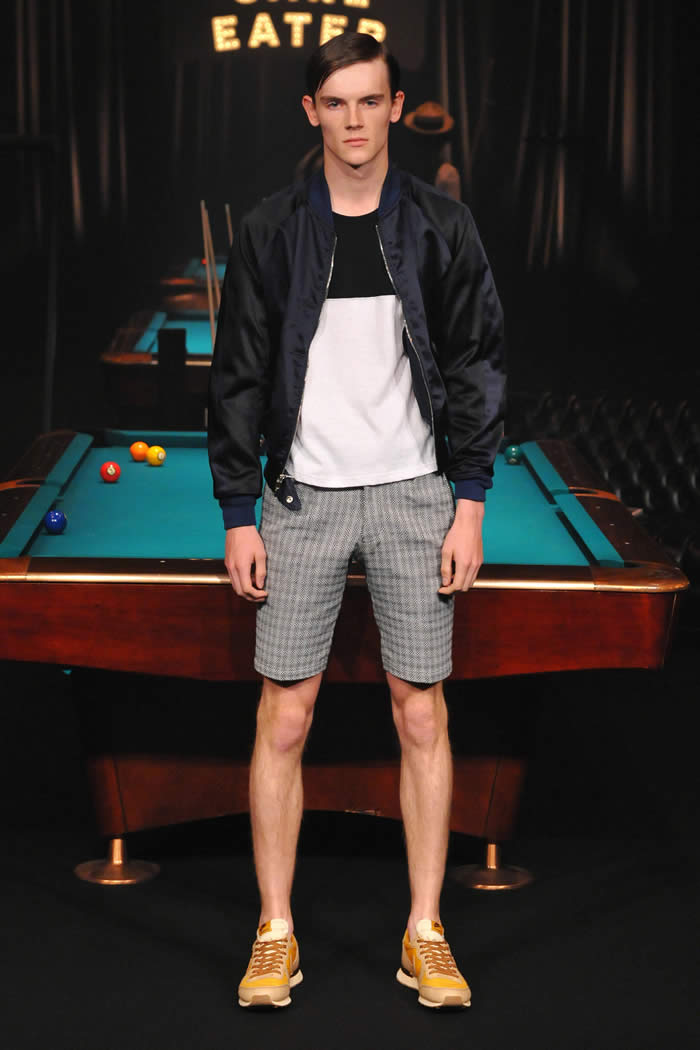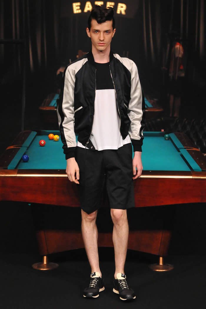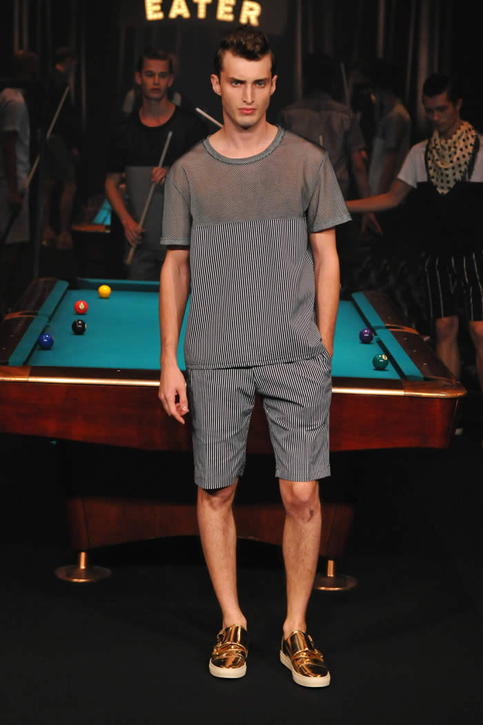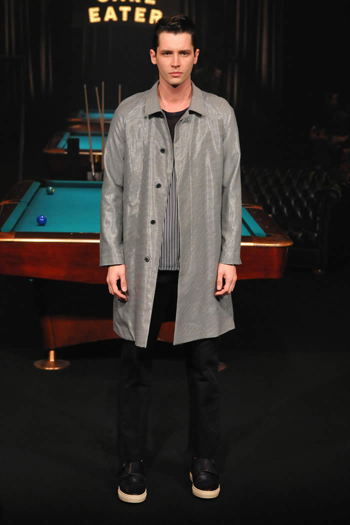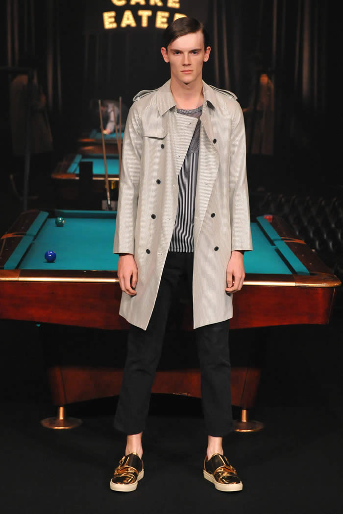 Billiard tables, leather sofas and bottled beer dotted Shigeki Morino’s spring runway, creating a setting reminiscent of a private club. Once the show started, models played pool in small groups before taking their leave one by one to pose for the cameras wearing the designer’s latest Patchy Cake Eater men’s collection. It was a unique and interesting staging choice, but the dim lighting made for somewhat difficult viewing of the pieces. What was obvious: The lineup in sync with the set  veered toward cool via a series of tailored yet relaxed suits and separates.