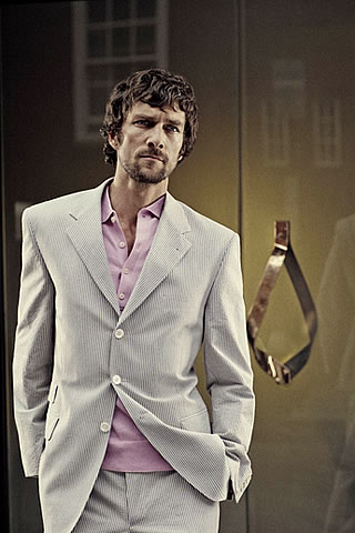 Source: Slim blue stripe three button seersucker suit with ticket pocket (p9xl/0102/g73/n), pink polo shirt (p9xl/172j/h94/p).