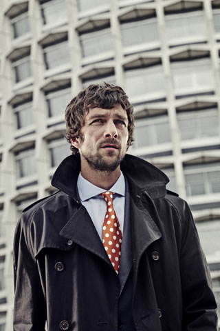Source: Mid fit grey cotton two piece suit with ticket pocket (p9xl/9565/g79/e), pale blue cutaway collar shirt (p9xl/859h/h62/s), black half lined trench coat (p9xl/105j/g95/b).