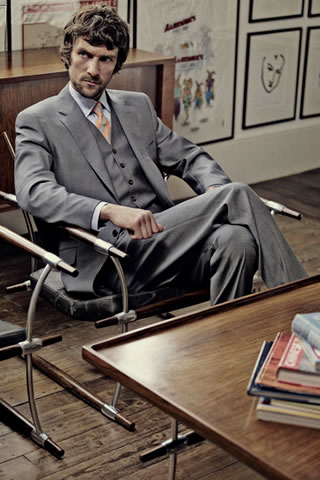 Source: "British collection" grey three piece suit (p9xl/9774/g86/l), blue and white stripe shirt (p9xl/377h/h85/s).
