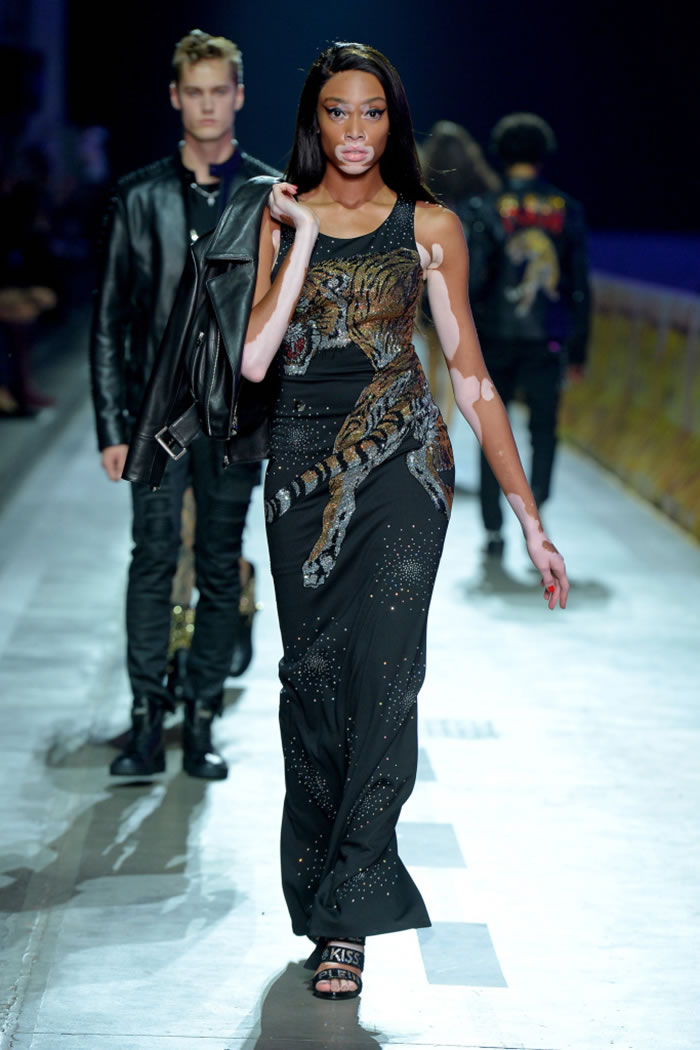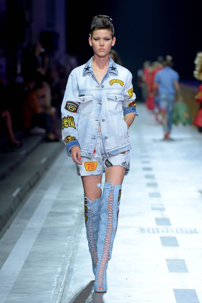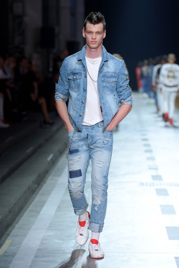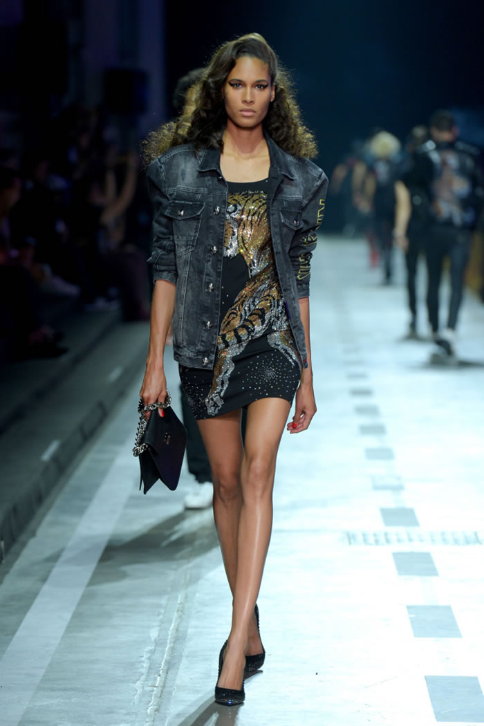 Jeremy Meeks sauntered down the adjacent runway with on his heels a run of Danny and Sandy clones puffing on cigarettes. From white tracksuits splattered with badges with hand-embroidered crystal flames creeping up the ankles to hand-painted denim, studded bikers and a sequin jacket with a giant tiger motif on the back, the garb and accessories echoed the elaborate bodywork of the cars crawling alongside.