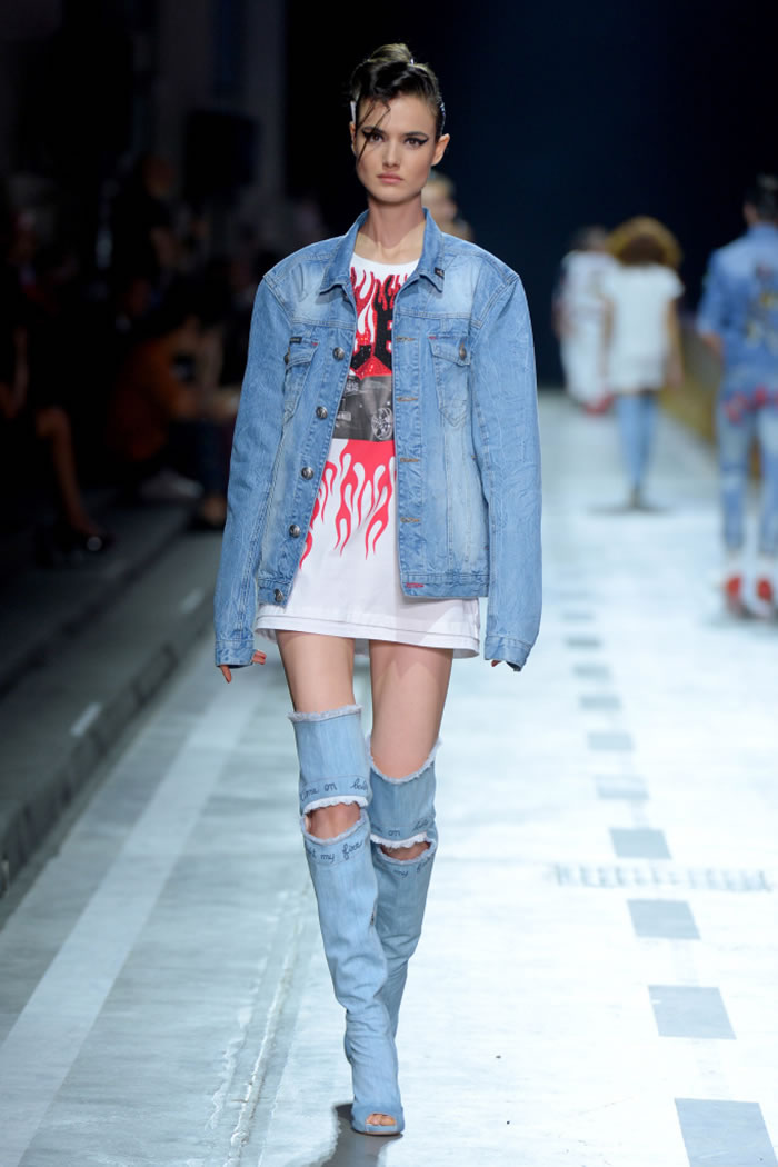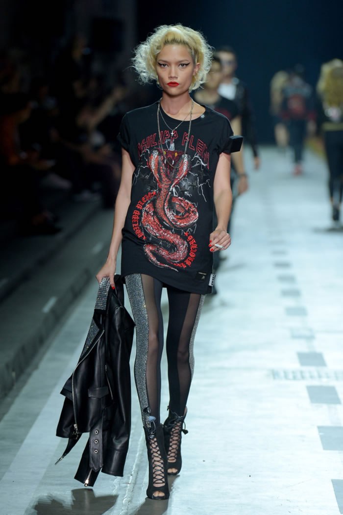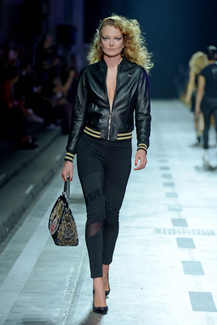 Jeremy Meeks sauntered down the adjacent runway with on his heels a run of Danny and Sandy clones puffing on cigarettes. From white tracksuits splattered with badges with hand-embroidered crystal flames creeping up the ankles to hand-painted denim, studded bikers and a sequin jacket with a giant tiger motif on the back, the garb and accessories echoed the elaborate bodywork of the cars crawling alongside.