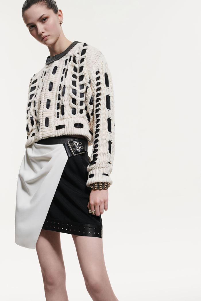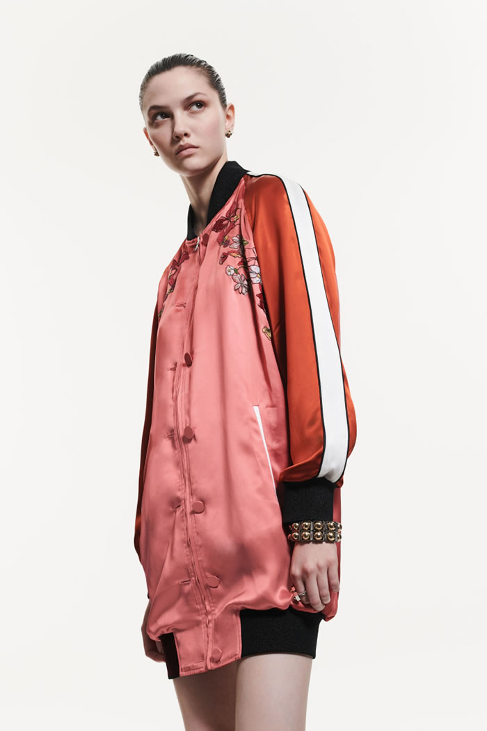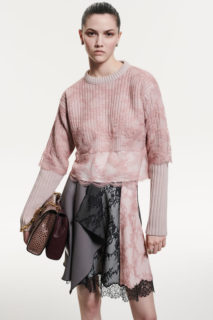 A long and silky baseball jacket doubled as a minidress while a fluttery, paneled lace skirt married happily with a chunky ribbed-knit sweater.