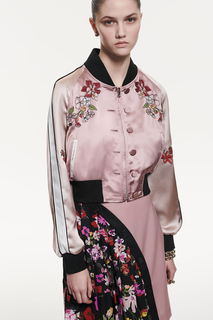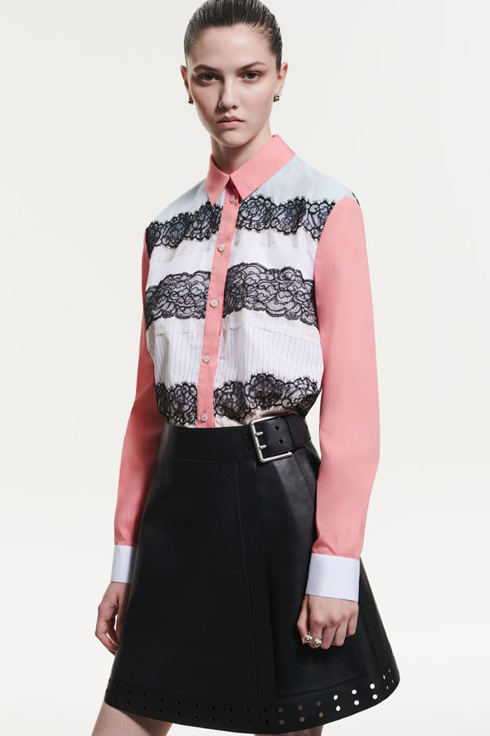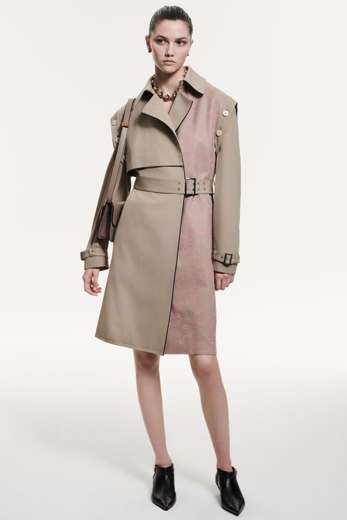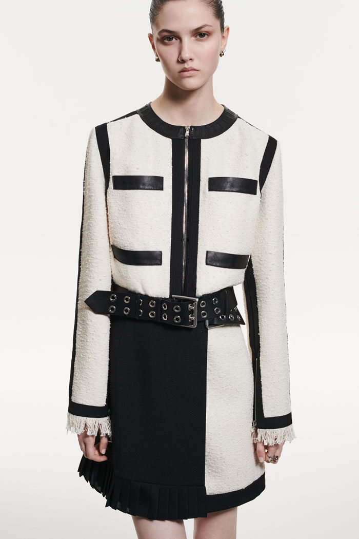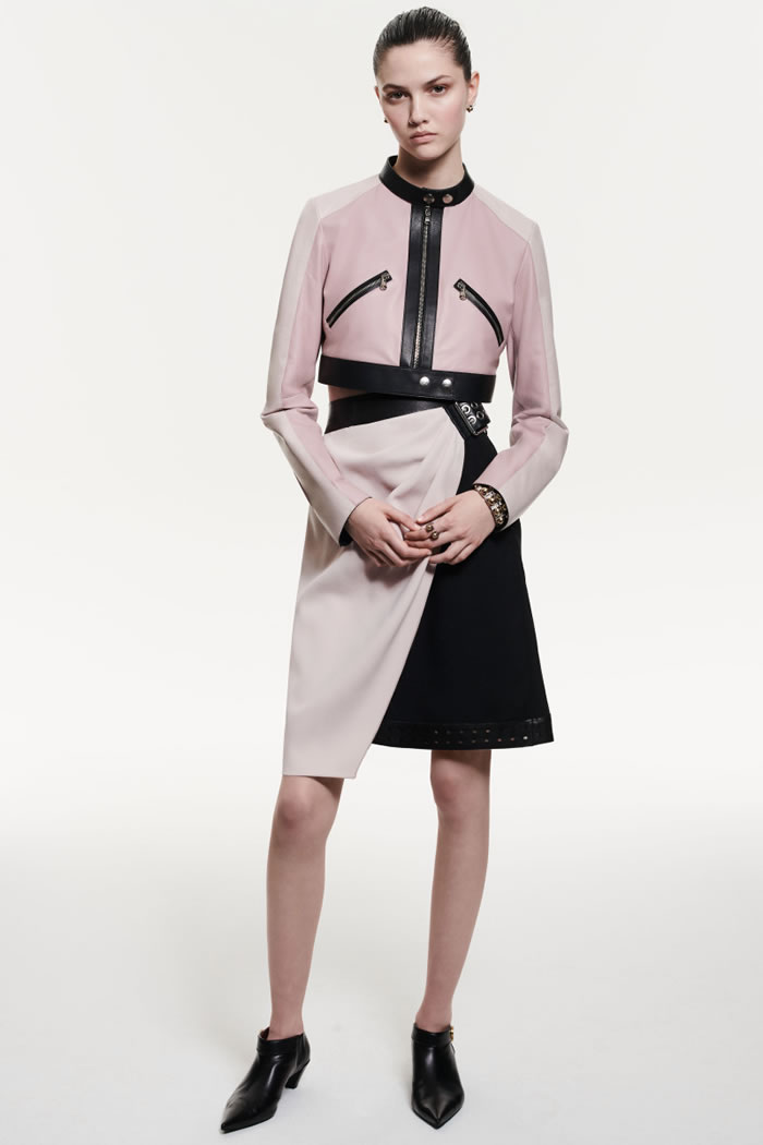 He lightened up the trenchcoat, adding a panel of pale pink and little decorative buttons around the armhole, and added a dose of sugar to a leather biker jacket. He cropped it short and close to the body and added patches of pink and black leather piping.