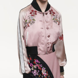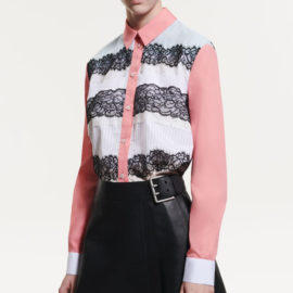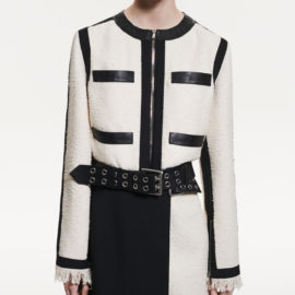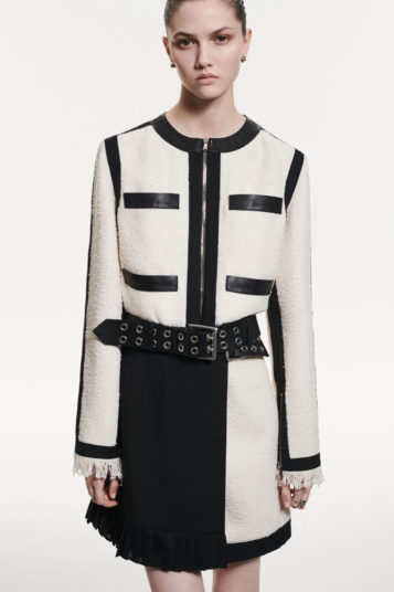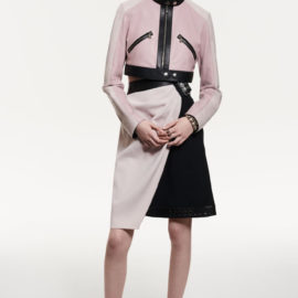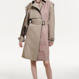 He lightened up the trenchcoat, adding a panel of pale pink and little decorative buttons around the armhole, and added a dose of sugar to a leather biker jacket. He cropped it short and close to the body and added patches of pink and black leather piping.