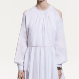 There was a ’60s Mod feeling to the collection, too, with Templer whipping up skater skirts with hole-punch details and grommeted belts. His neat and elegant A-line dresses had pleated side panels, a contrast of strict and soft.