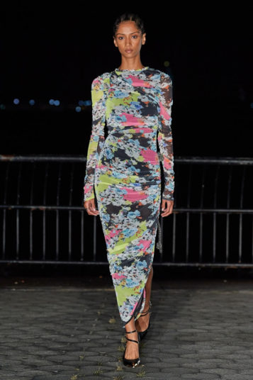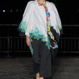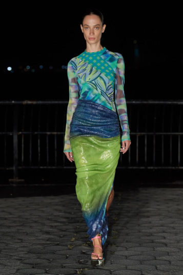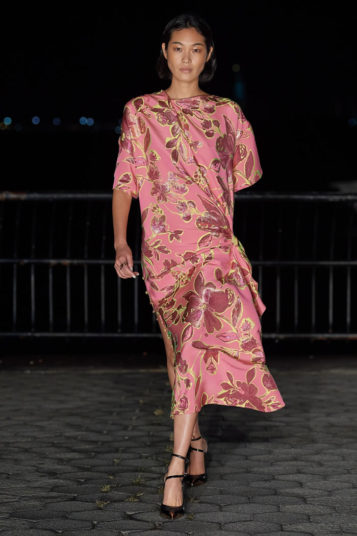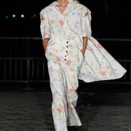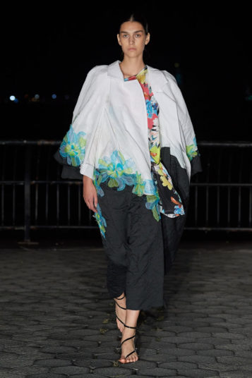 Fabrics, prints, and shapes were shared across the gender spectrum on his runway, so were his shoes. In keeping with that mission, Gurung’s clothes broke down other kinds of binaries. He mixed American forms of dress with Asian ones and combined couturish silhouettes with the ease of sportswear.