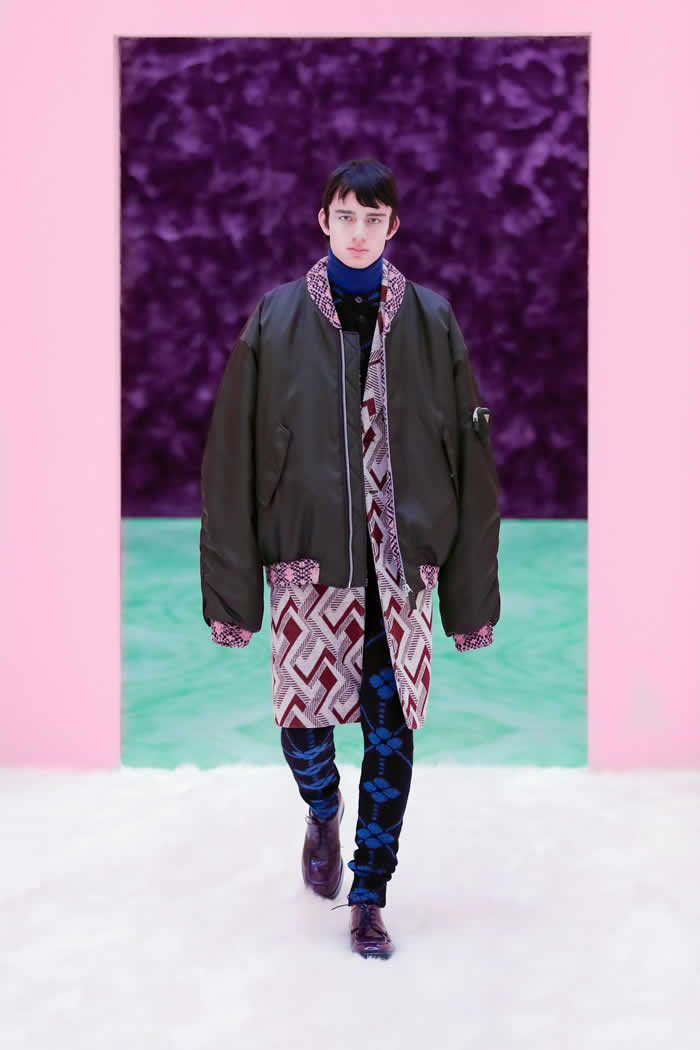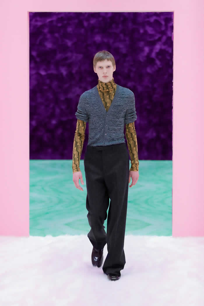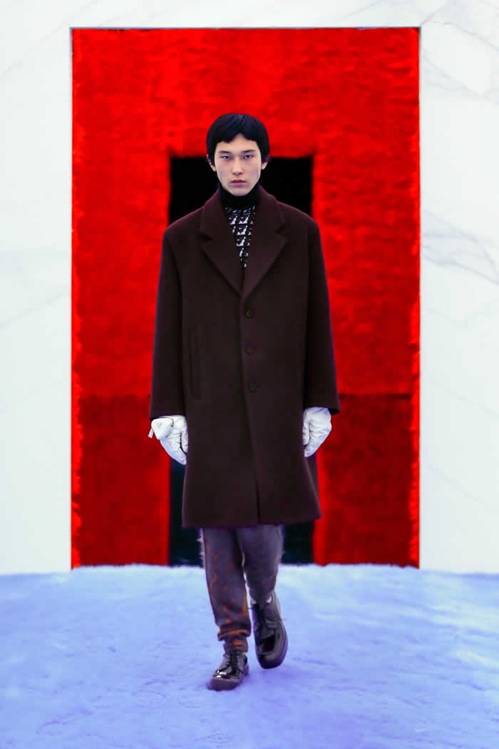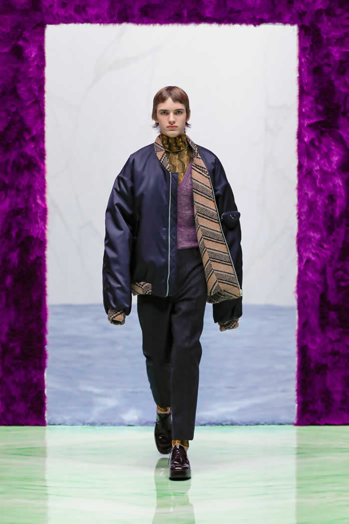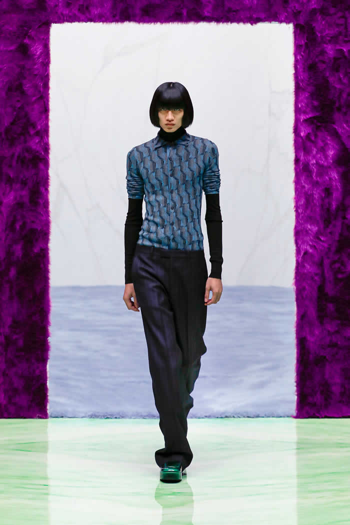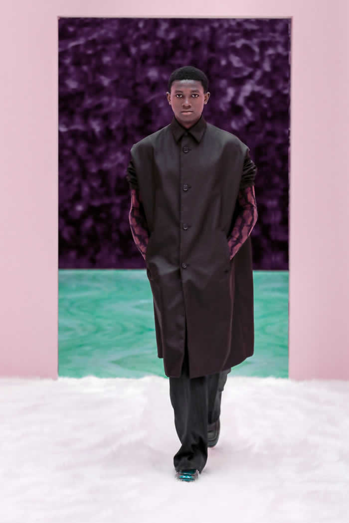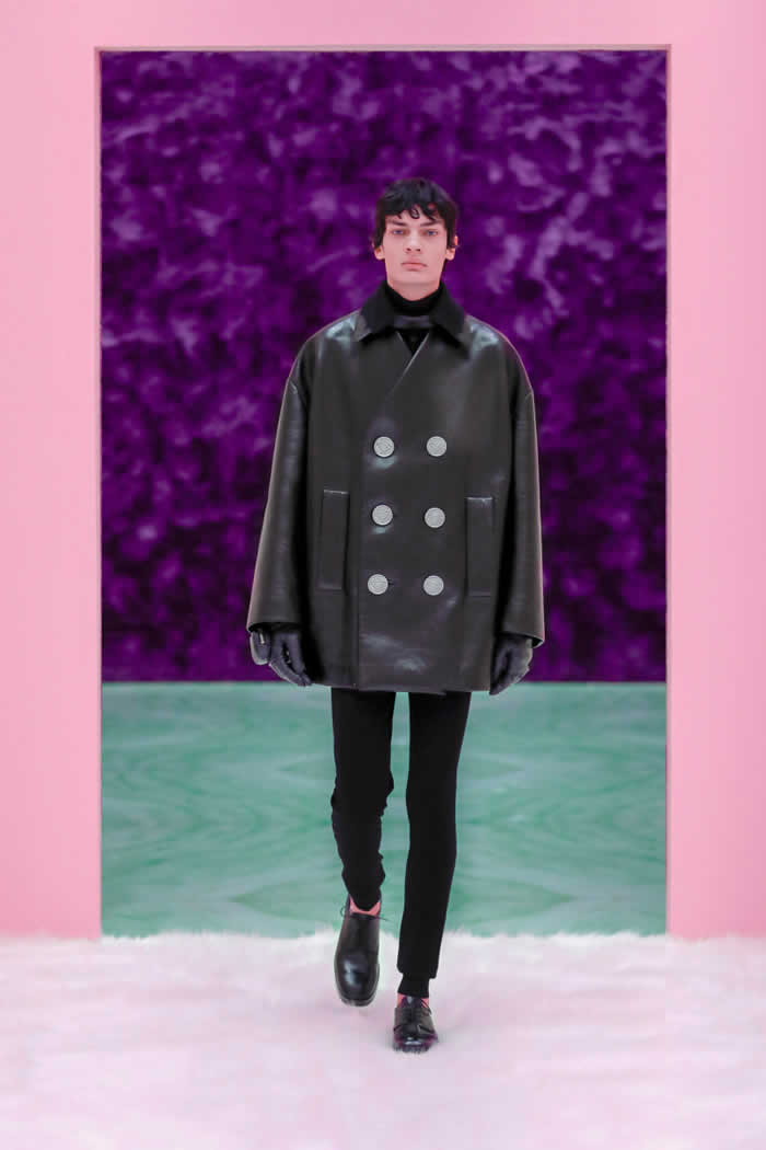 That was one significant departure for this first co-creatively directed menswear collection authored by the two: in staging, setting, music, decoration and more, past Prada shows have often featured reverse-engineered clues and obliquely telling easter eggs that allow a reading to unfold.