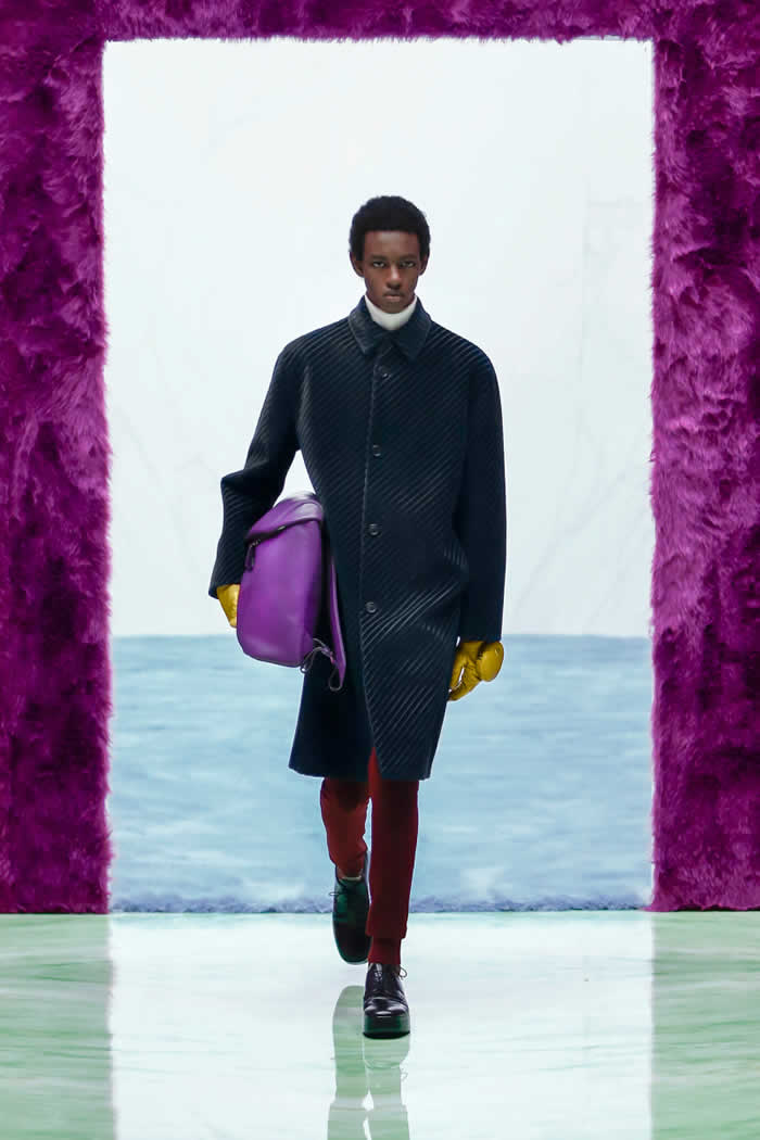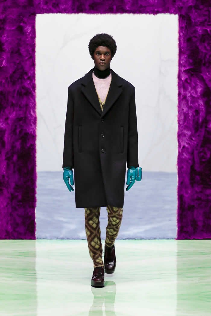 These included sleeve-hoiked suiting, sometimes in pinstripe (a former Mrs. Prada no-no that Simons had charmed her into permitting), oversized re-nylon parkas with jacquard linings, similarly lined and rib-hemmed oversized bombers, topcoats in boucle, brushed teddy bear and diagonal wale, long john coordinated knit jackets, and high-collared, lapel-less peacoats. Some of the parkas and bombers featured Prada hardware logos at the top of the spine—a Margiela-expert acquaintance suggested this might be a hat tip—and many of the looks were accessorized by pandemic-perfect leather gloves featuring attached purselets.
