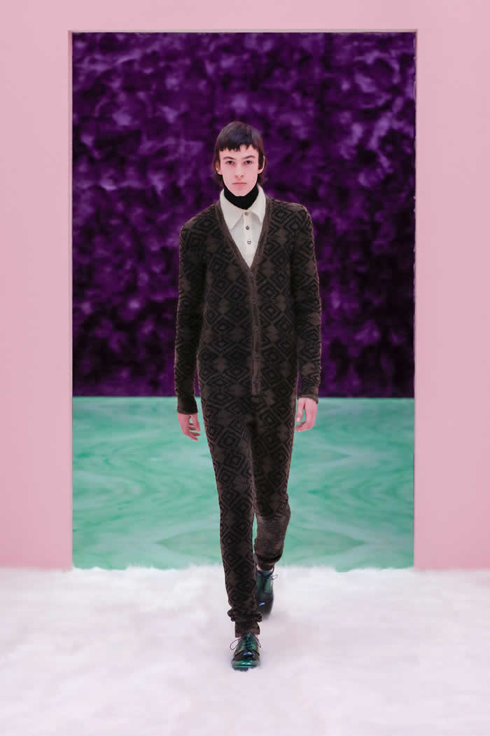Today instead we saw a menswear collection dominated by a garment that acted as a single motif that could, depending on your feeling, be worn, felt and seen in multiple ways. That garment was a knit patterned long john. Above the foundation of the model wearing it, a long john was the cladding upon which every look in the show was constructed (although sometimes that look went unadorned, all-long john).
