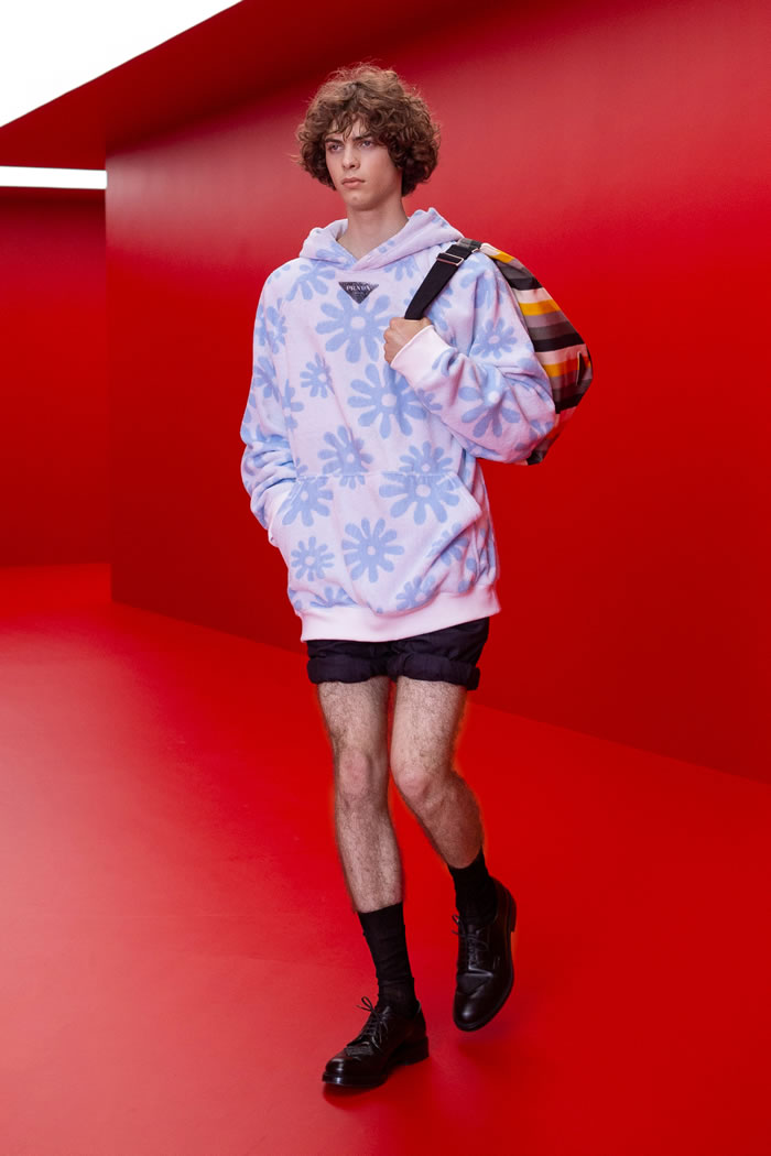 The notion that next summer’s Prada boys would IRL go paddling in their coral-decorated derby shoes and black socks pulled up high was pragmatically a blatant no-no, but metaphorically an illustration of the transition this collection was working to encapsulate. More convincingly beach-ready were the floral-shorn terry hoodies, the skorts of course, the beautiful bucket bags in cracked leather and rowing stripe cotton drill, and those awesome sou’wester-adjacent hats.