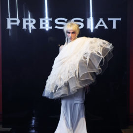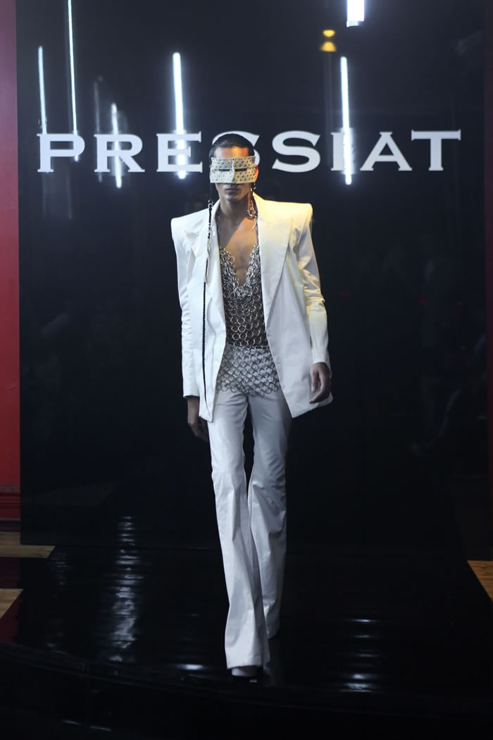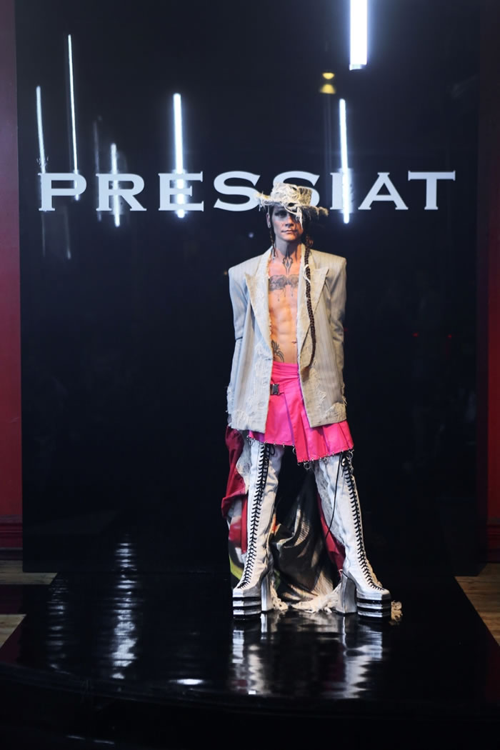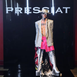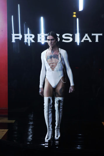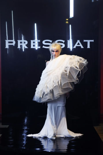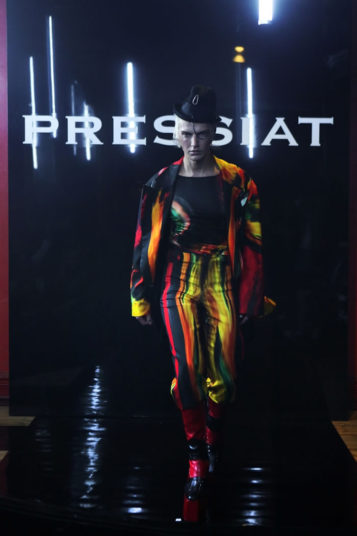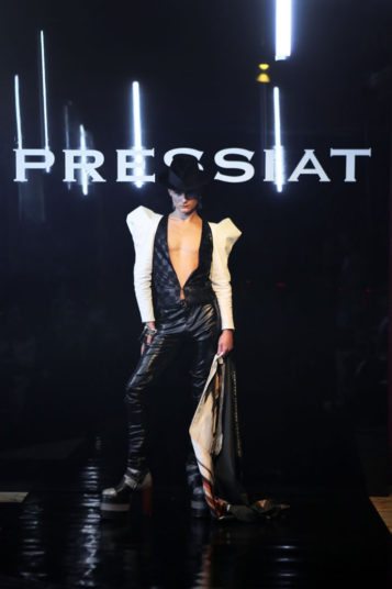 But forget any ideas about models walking sedately down a linear catwalk. His entourage, including fellow designer and best friend Victor Weinsanto, took to the wooden dancefloor in the extravagant designs of his “Glitter Wanderer” collection, playing and posing amid cheers and shouts of an audience that included artist Michaela Stark.