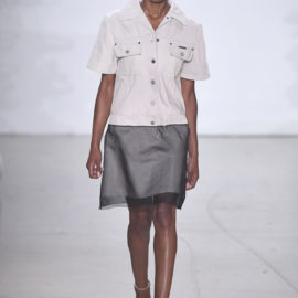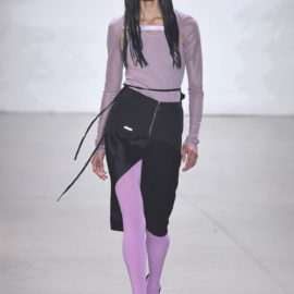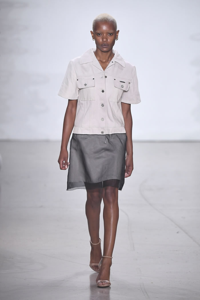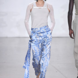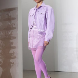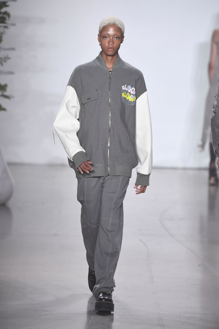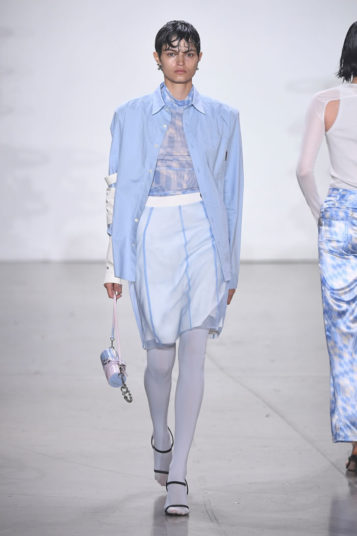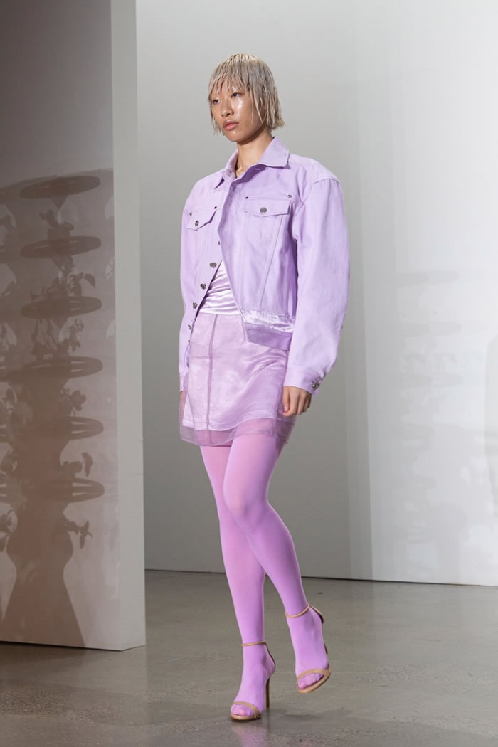 Key pieces: Youthful tailoring with harness details on pants; a lavender pencil skirt paired with a turtleneck with a floral design (a more grown-up look for the brand); cutout necklines; the use of recycled poly organza as a sheer overlay on skirts and dresses, which gave the lineup a touch of sensuality, and bomber jackets. The finale show pieces combined metal ball chains with handmade flowers created by gently heat-molding upcycled plastic bottle waste.
