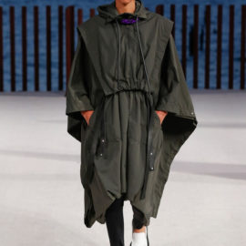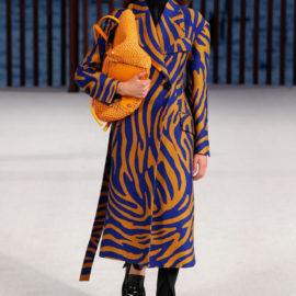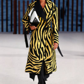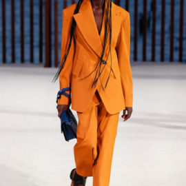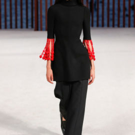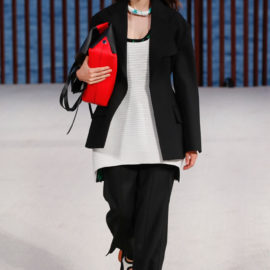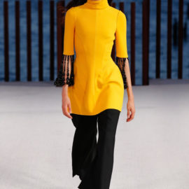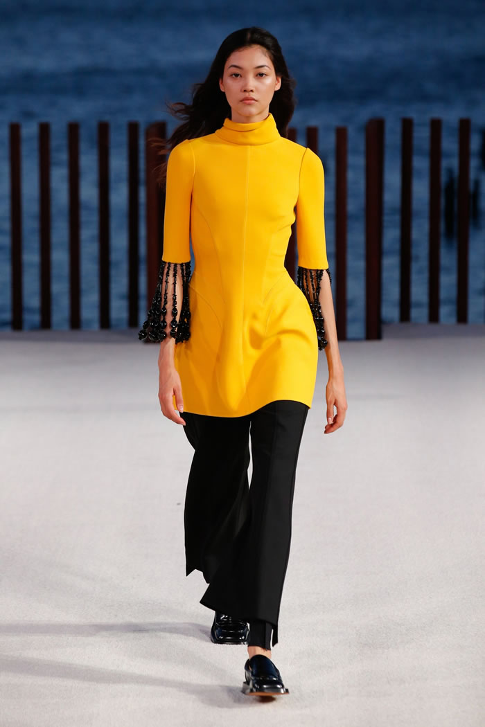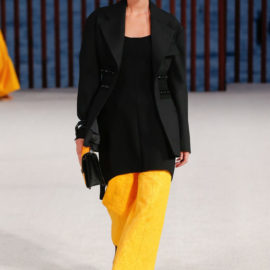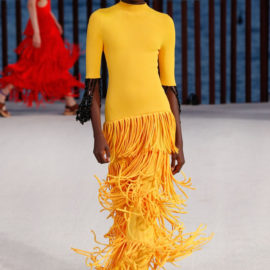 Hernandez and McCollough’s first order of business was rethinking the suit. Next spring theirs will come in vivid shades of coral or orange cotton jacquard. Basic black, meanwhile, isn’t so basic when suit bottoms are cut tight like bicycle shorts with several inches of swingy fringe below the hems.