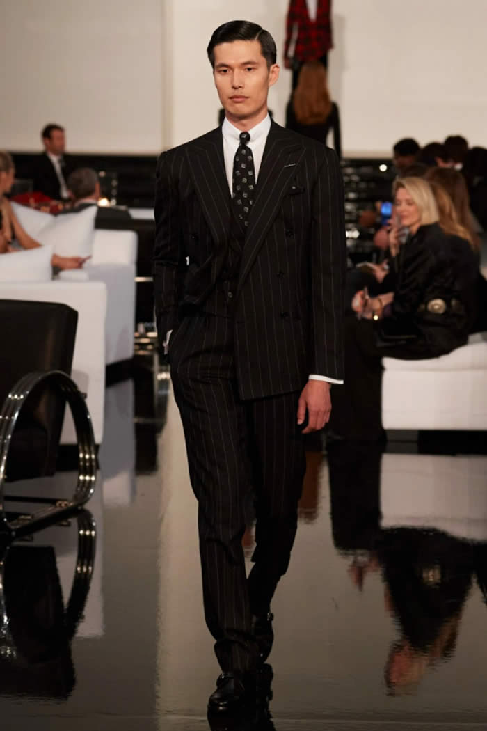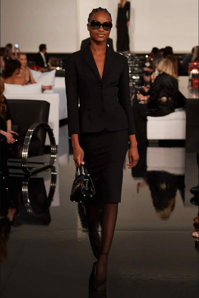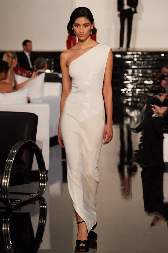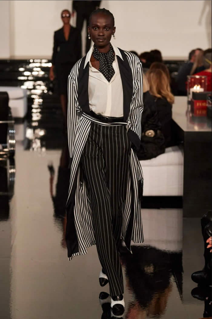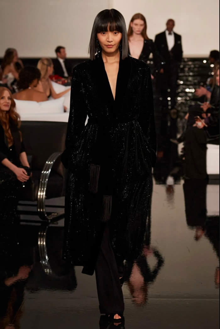 From that beginning, there was a passage devoted to classic black-and-white tailoring; an après-ski section that saw a bejeweled Fair Isle sweater paired with a floor-length skirt; a few books devoted to the very Ralph pastime of horseback riding, to lift the name of the 2019 HBO documentary of his life; and a high evening series that read like a love letter to New York, not least of all a black column dress with the skyline picked out in crystals.