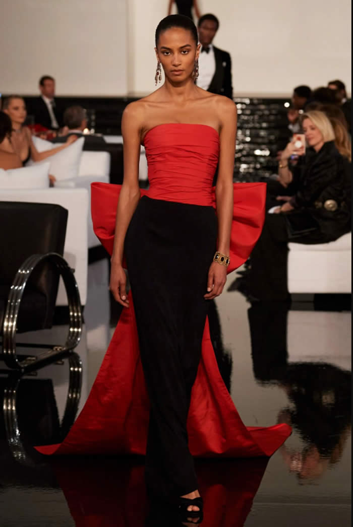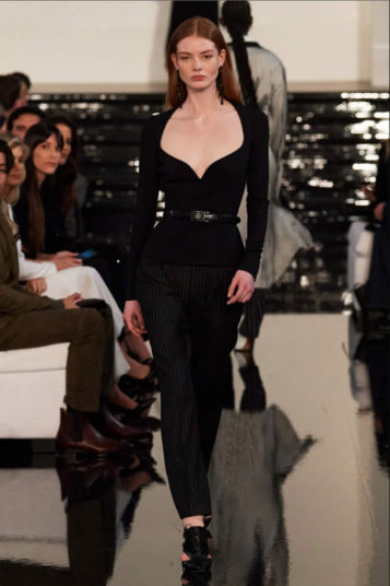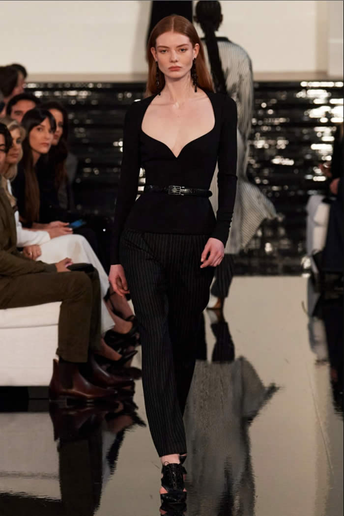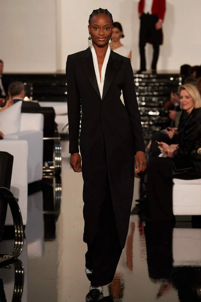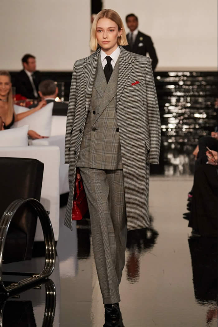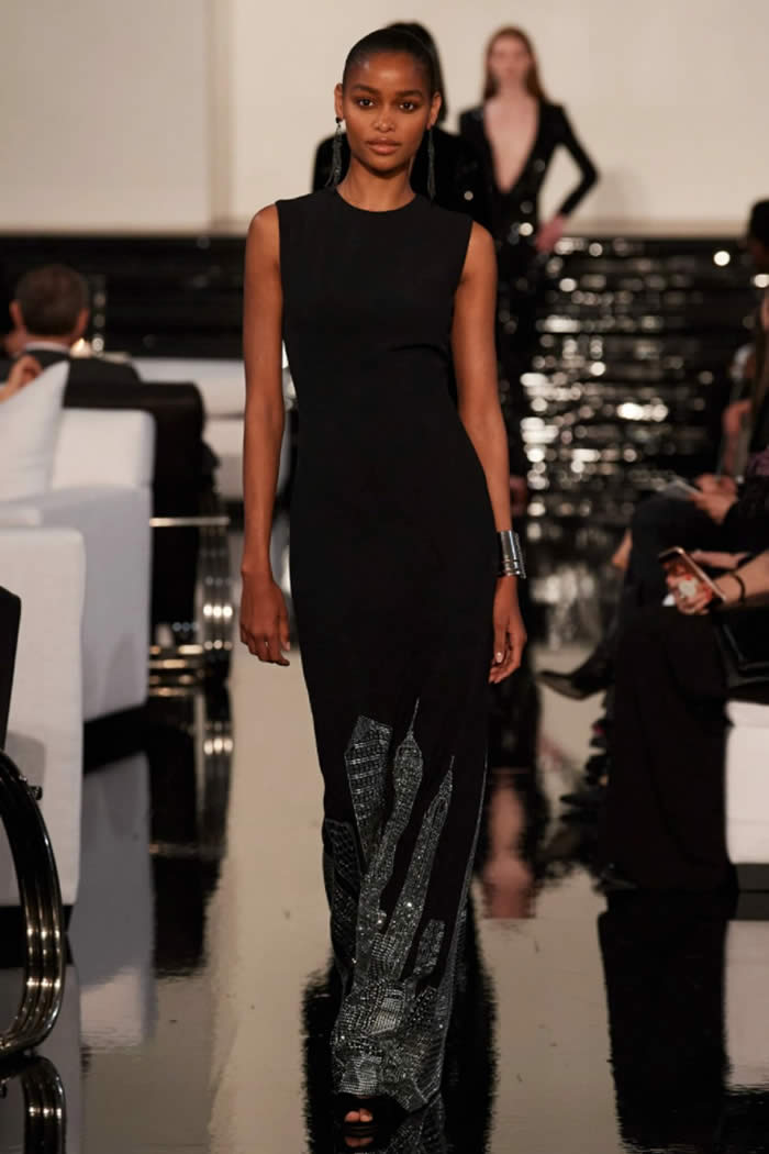 From that beginning, there was a passage devoted to classic black-and-white tailoring; an après-ski section that saw a bejeweled Fair Isle sweater paired with a floor-length skirt; a few books devoted to the very Ralph pastime of horseback riding, to lift the name of the 2019 HBO documentary of his life; and a high evening series that read like a love letter to New York, not least of all a black column dress with the skyline picked out in crystals.