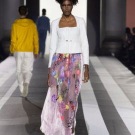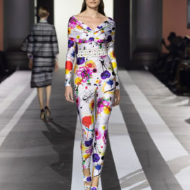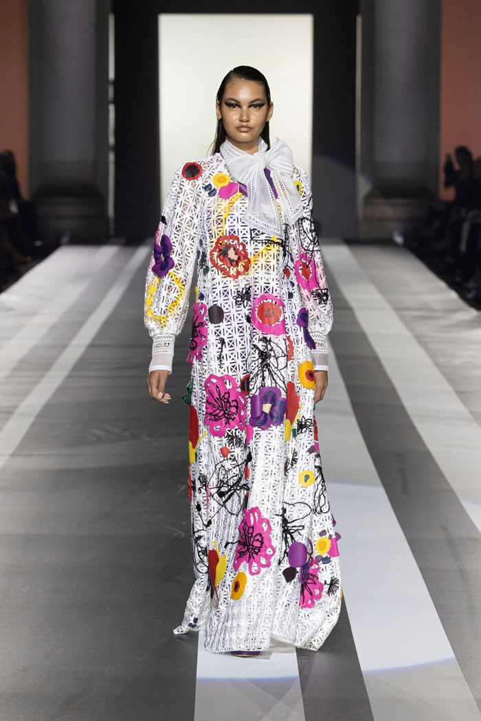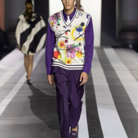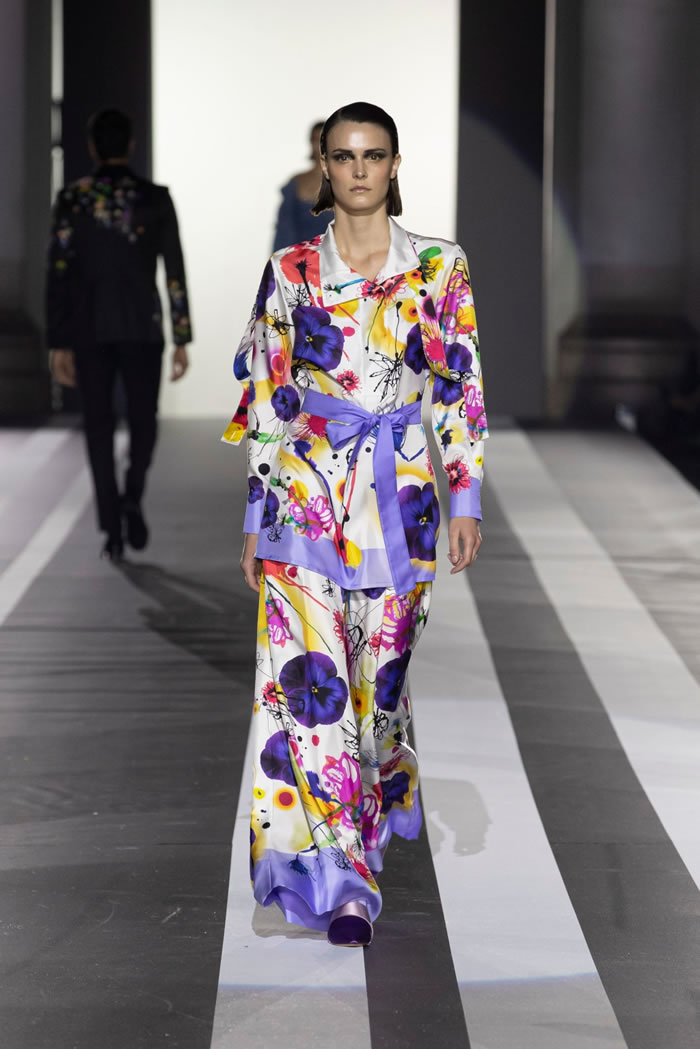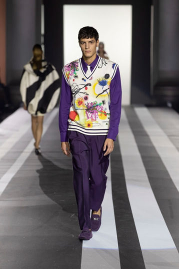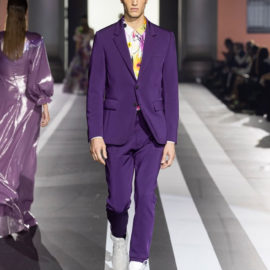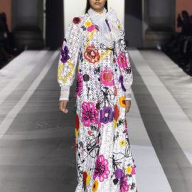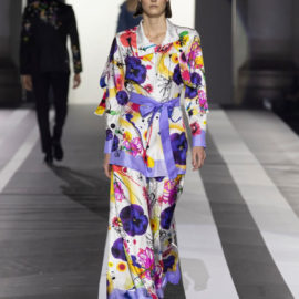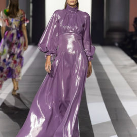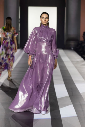 Key pieces: An airy silk maxidress splashed with a watercolor-like floral pattern and enriched with embroideries; a silk georgette fluid gown, worked in dégradé purple, decorated with a delicate bow on one shoulder; a cutout evening frock with a graphic bodice, and men’s leather jackets in white, yellow and purple.