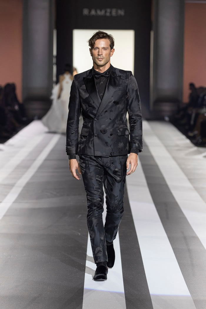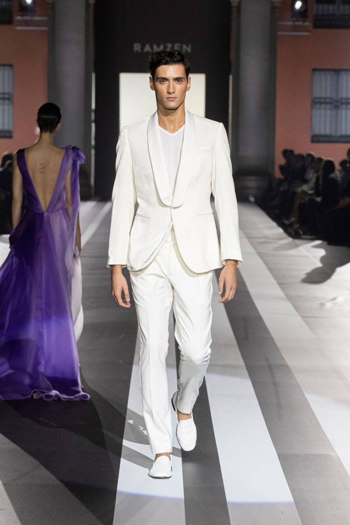 Italy-based luxury brand Ramzen made its runway debut in Milan unveiling its spring collection Sunday night in the scenic courtyard of Palazzo Serbelloni. A dance performance opened the display, while the show, featuring both men’s and women’s looks, marked the global launch of a brand founded and designed by Abdul Al-Romaizan.