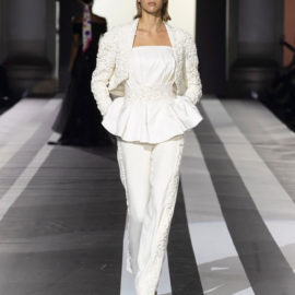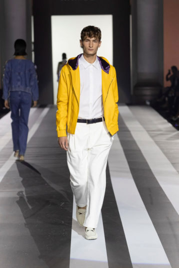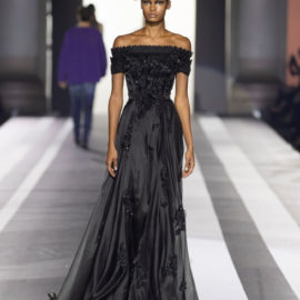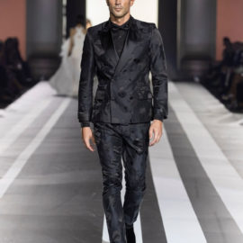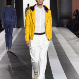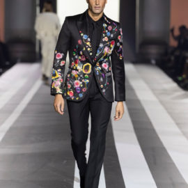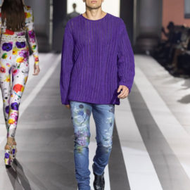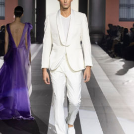 The look: Flamboyant eveningwear juxtaposed with daywear. Featuring couture-like details and embellishments, gowns were cut in feminine, sensual silhouettes, while men’s tailoring was peppered with eccentric touches. Denim and leather added a more casual vibe to the lineup.