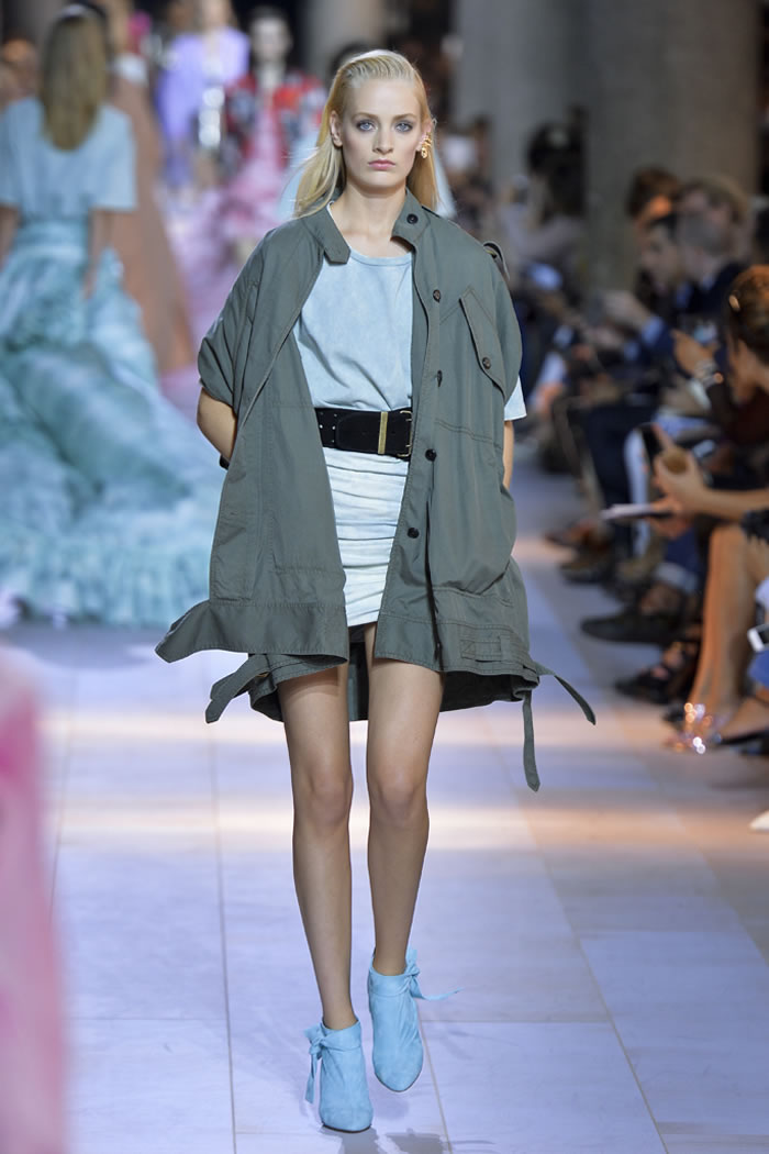 To be fair, the Norwegian designer made good on the above statements, delivering a strong injection of youth and street savvy along with a more freewheeling approach to dressing. To him, a sleeveless biker vest and a rugged utility parka are the pashminas of today, tossed over cocktail dresses, a billowing silk skirt, loud leggings, whatever.