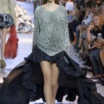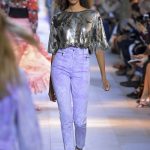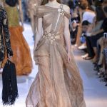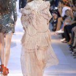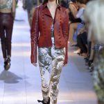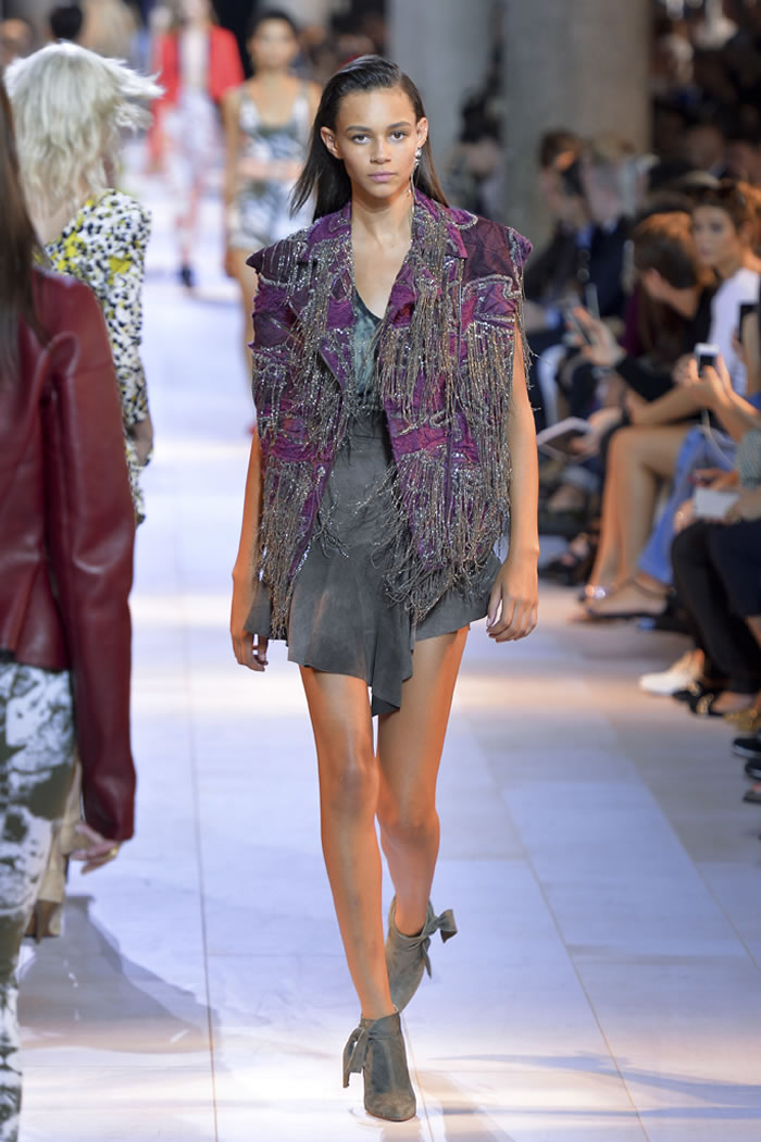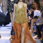 Dundas exalted the capabilities of Cavalli’s ateliers to realize Flintstones-esque suede dresses and tops, swinging-chain embroidered vests and milk-maiden dresses in tie-dyed silks – all distinct from the baroque, super polished approach of yore.