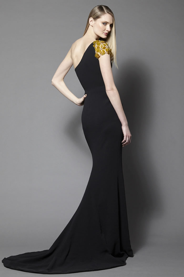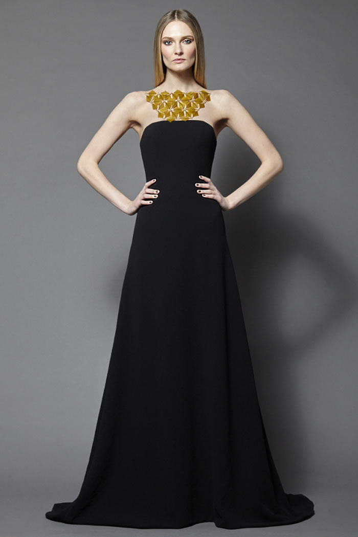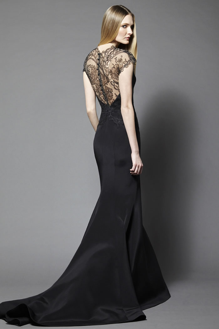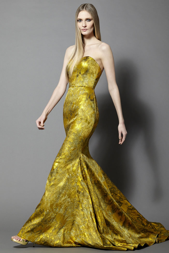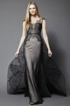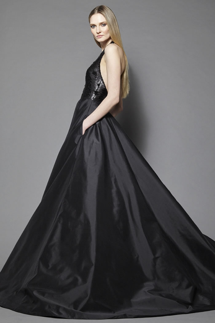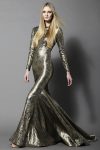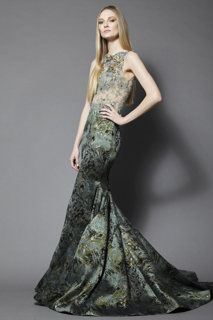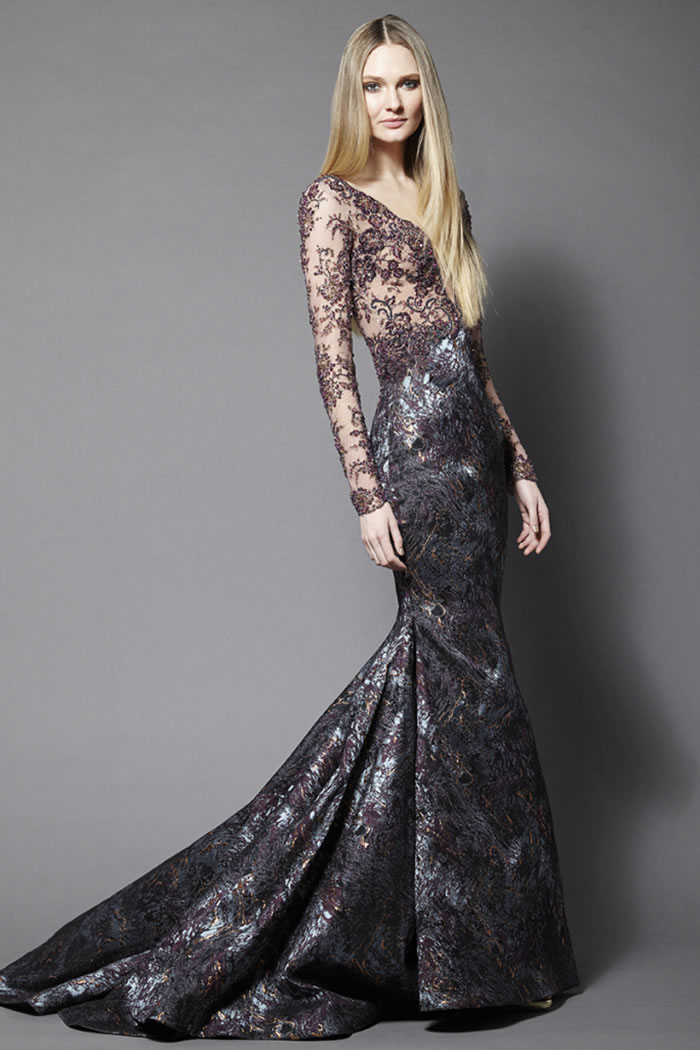 The Hotel Le Meurice opposite the Tuileries Gardens in the center of Paris was the setting for Romona Keveza’s fall presentation. Keveza subtly echoed the tapestry, palette and design details from hotel’s interiors in some of her dresses — for example, a golden marble-like stretch jacquard long-sleeve gown. She also worked a crepe fabric into polished streamlined silhouette dresses for the customer who doesn’t like fussiness, while adding a feather motif to others, which resulted in an almost necklace effect. Elsewhere, she experimented with beaded illusion dresses in deep autumnal colors from burgundy to teal with barely there tulle for that true nude effect.