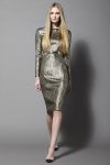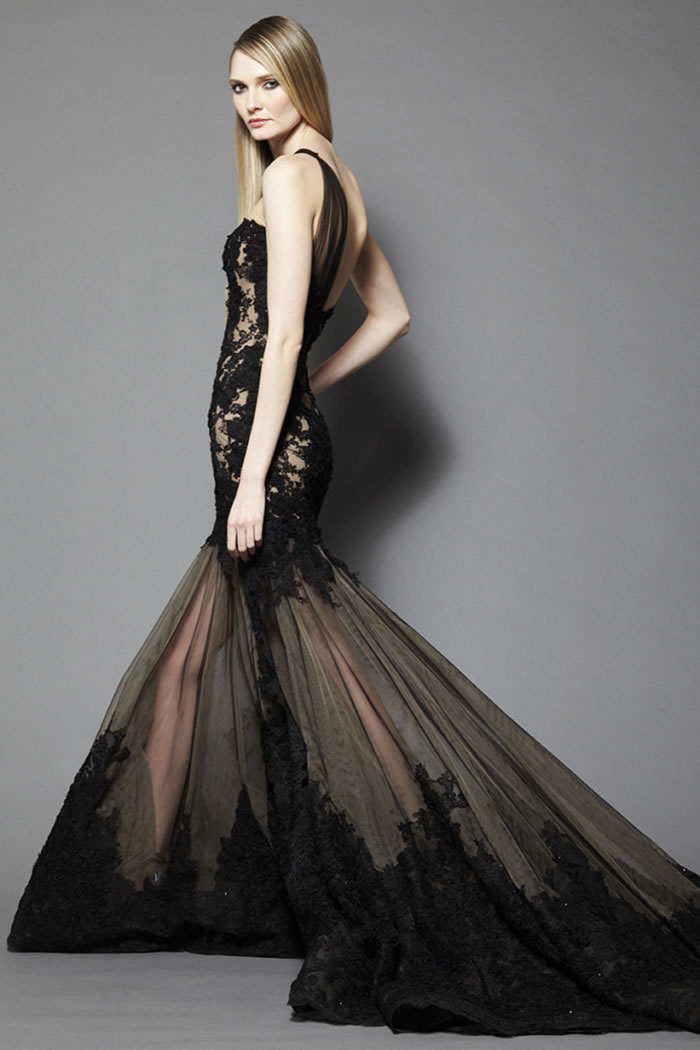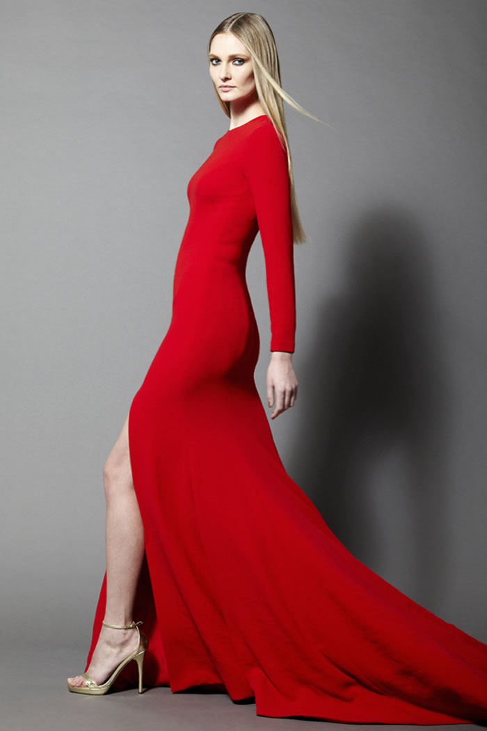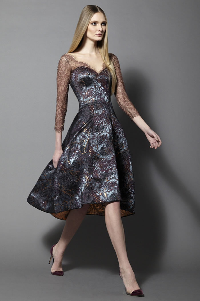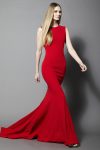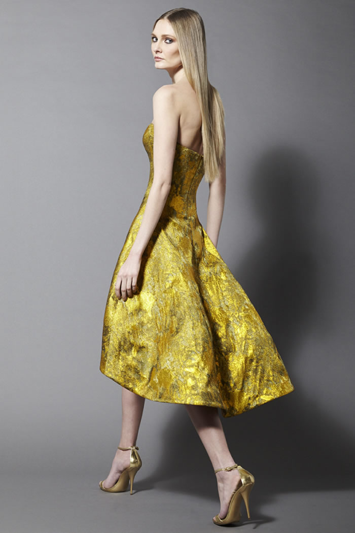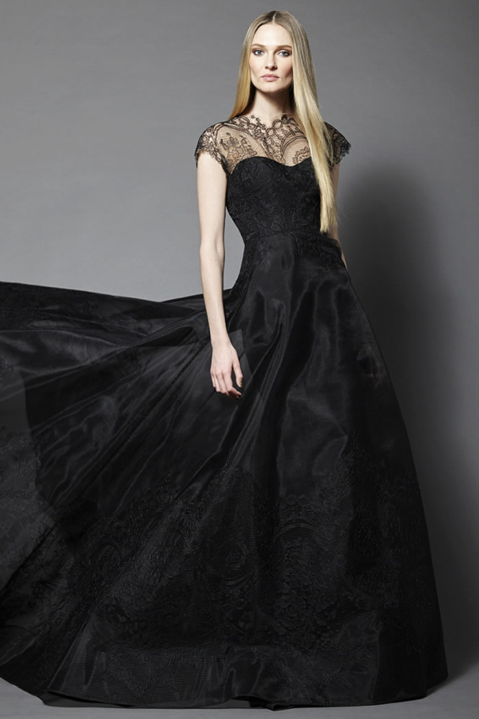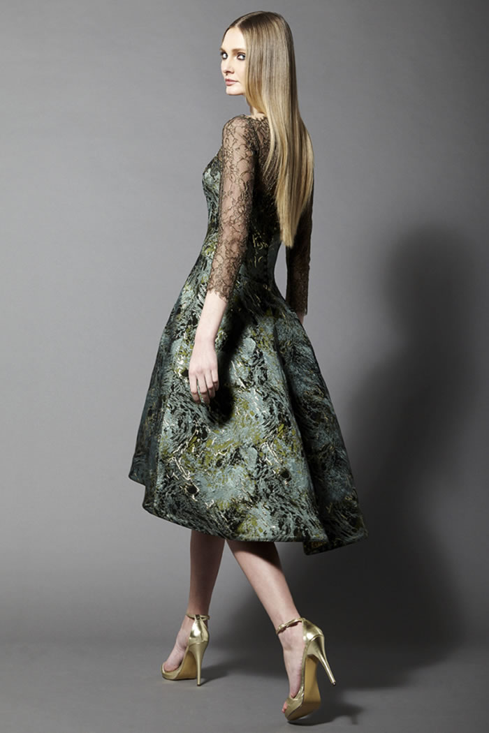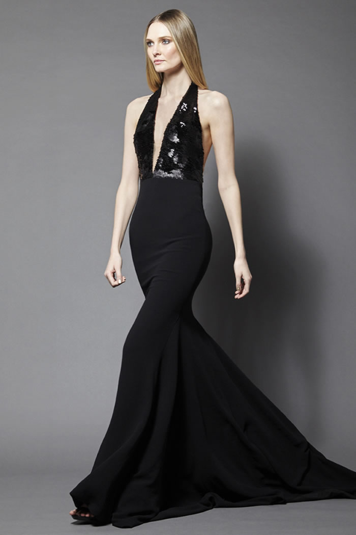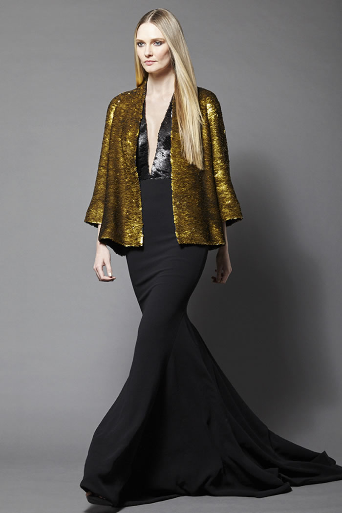 The Hotel Le Meurice opposite the Tuileries Gardens in the center of Paris was the setting for Romona Keveza’s fall presentation. Keveza subtly echoed the tapestry, palette and design details from hotel’s interiors in some of her dresses — for example, a golden marble-like stretch jacquard long-sleeve gown. She also worked a crepe fabric into polished streamlined silhouette dresses for the customer who doesn’t like fussiness, while adding a feather motif to others, which resulted in an almost necklace effect. Elsewhere, she experimented with beaded illusion dresses in deep autumnal colors from burgundy to teal with barely there tulle for that true nude effect.
