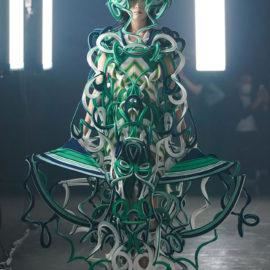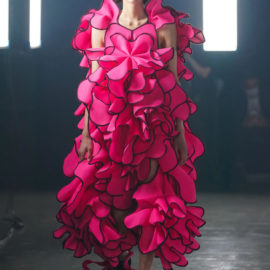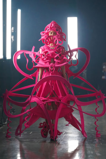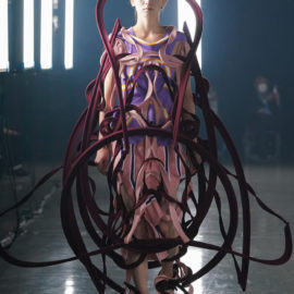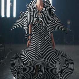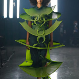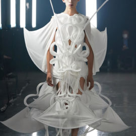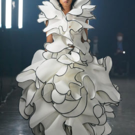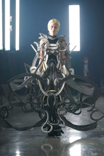 The result: In a season when most designers are playing it safe and erring on the side of the commercial, Okazaki’s unconventional, made-to-order pieces were a breath of fresh air, as well as being technically impressive.