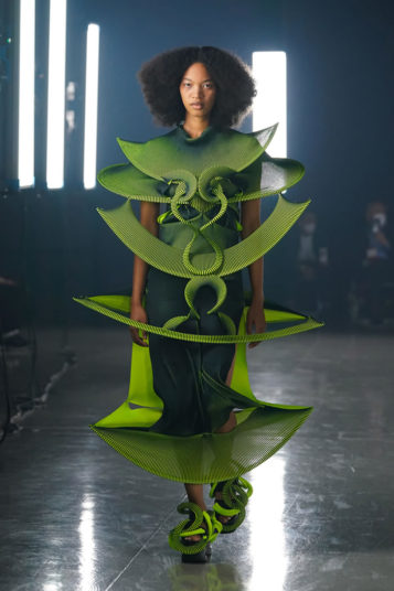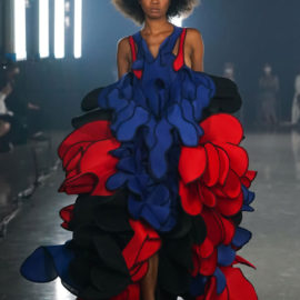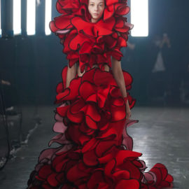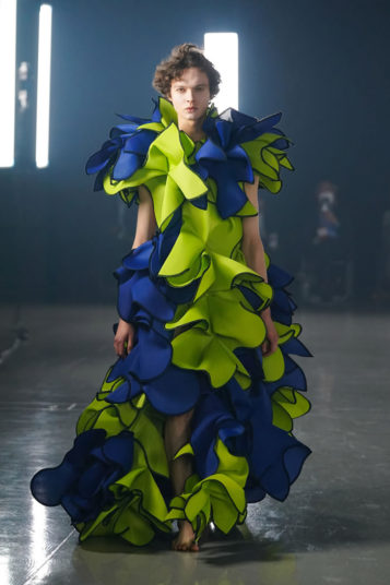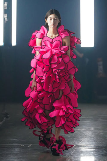 Unconventional dresses with sculptural swirls or frothy ruffles brought drama and resembled a swarm of colorful insects