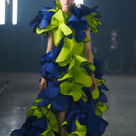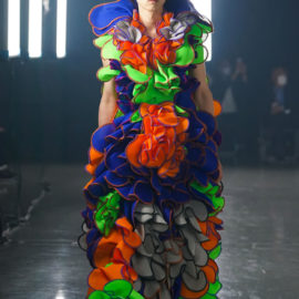 Main message: According to his profile, Okazaki seeks to “explore the harmony with nature,” and this season he sent out a swarm of fantastical dresses like colorful insects.