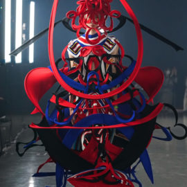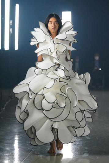 Ryunosuke Okazaki is a newcomer to Tokyo Fashion Week, but his inaugural show will not soon be forgotten. He brought drama and the avant-garde at a time when most brands are focusing on comfort and practicality, neither of which were aspects he seemed particularly concerned with.