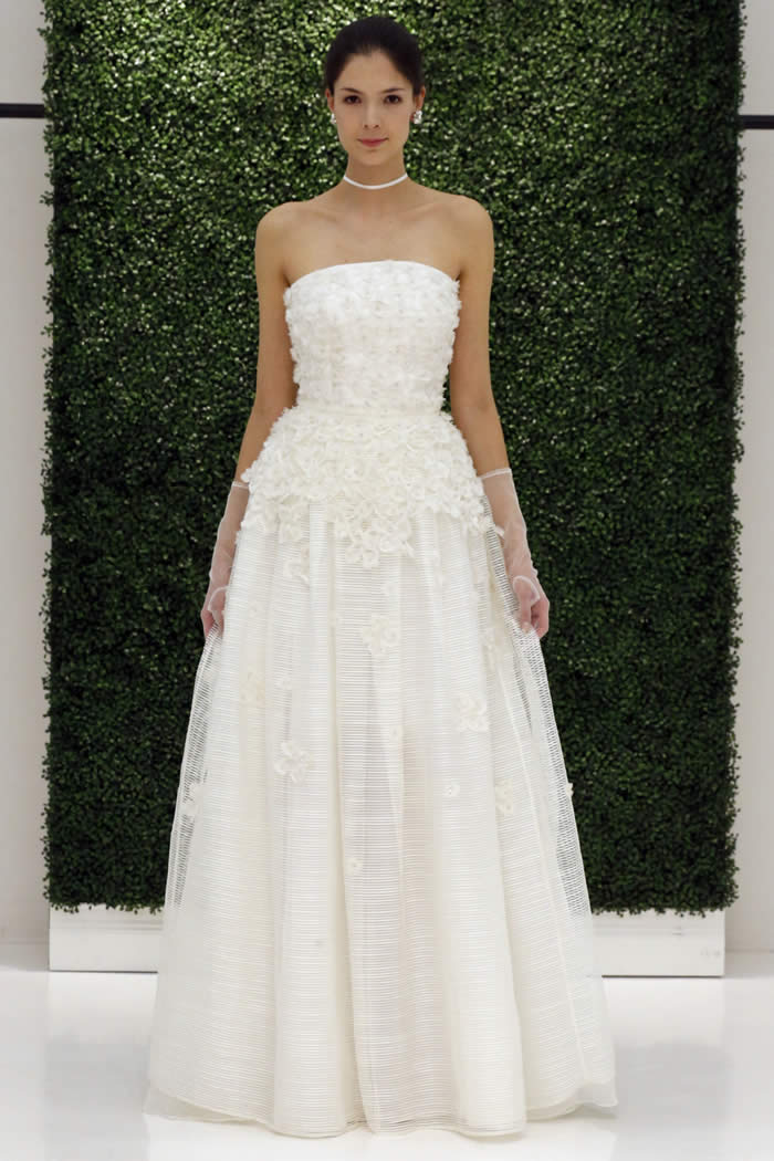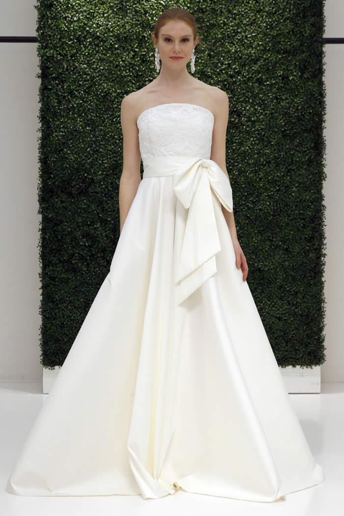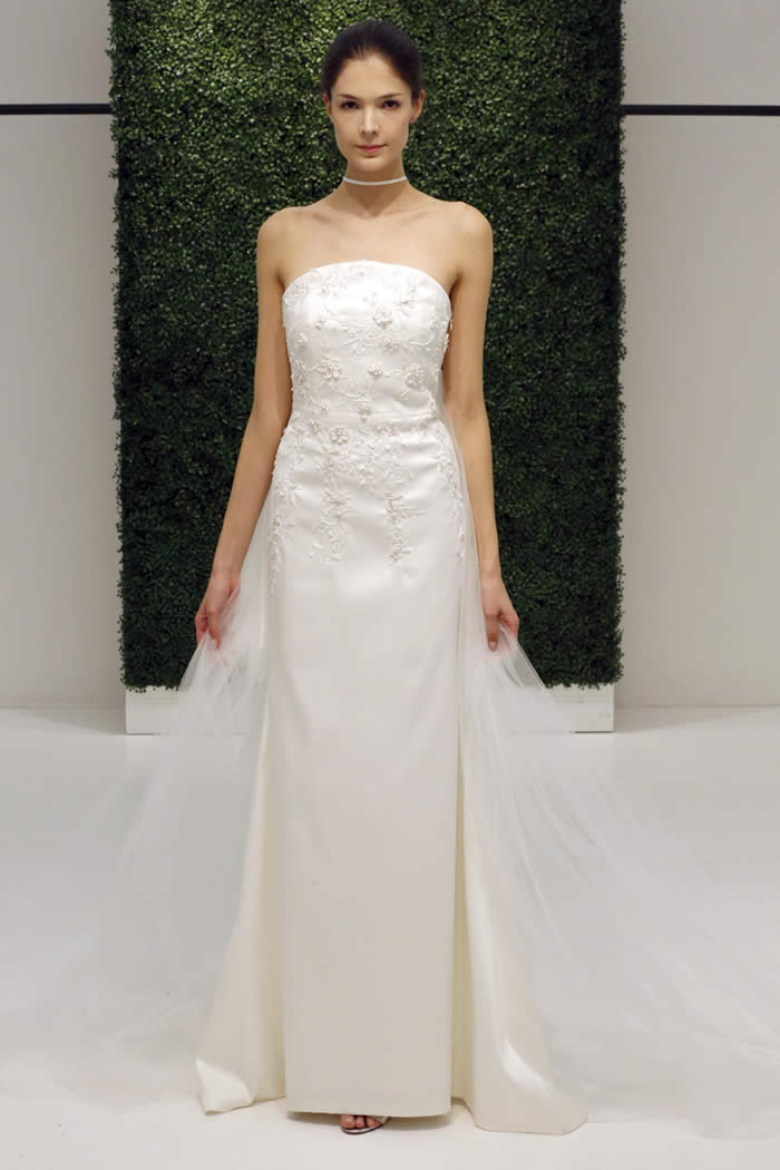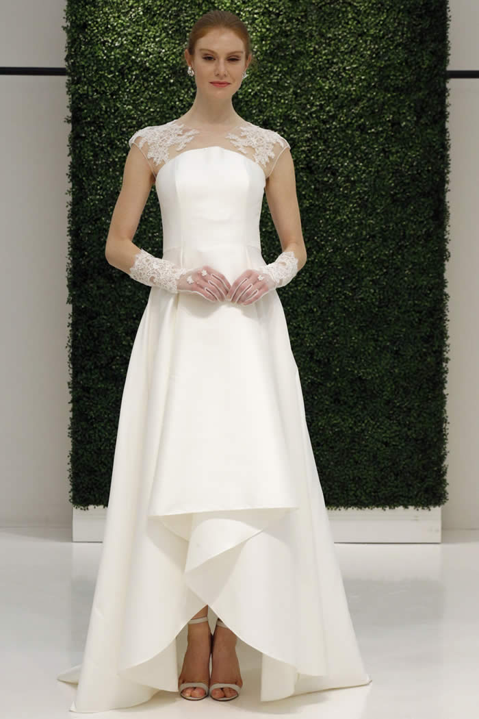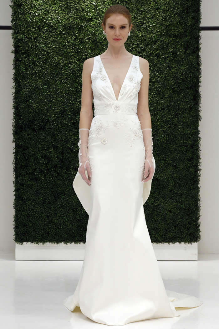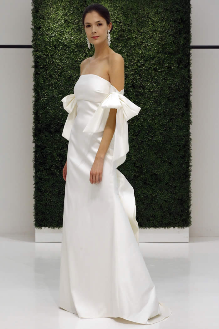 At the company’s Garment District showroom, models milled about in gowns that looked just as good from every angle – since a bride will “be standing for hours,” Sachin said – nwith plunging backs, back bows and sheer tulle trains. A strapless tea-length dress covered in shredded tulle embroidery felt fresh and playful; ditto an off-the-shoulder A-line gown in silk faille with exaggerated bow sleeves.