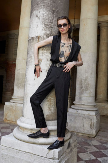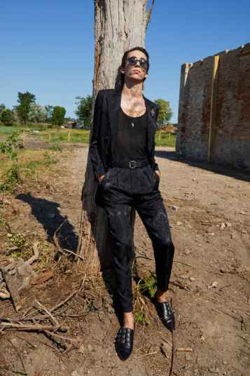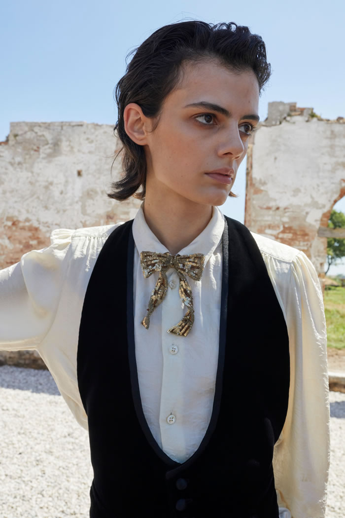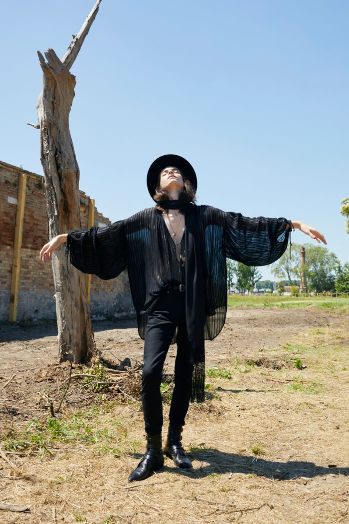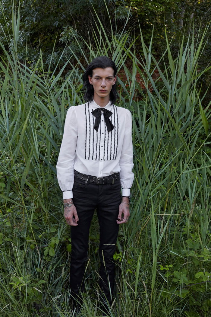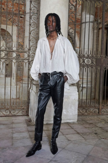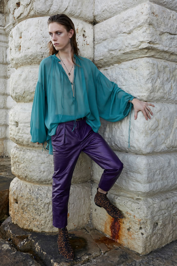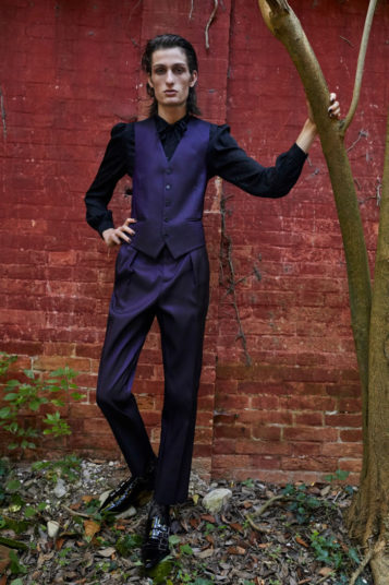 Rather than feeling vintage, the collection had a timeless appeal. The boundaries between feminine and masculine blurred, as did the lines between everyday pieces and occasion outfits, for a wardrobe designed for eccentric men who feel comfortable in frilled lace shirts, dramatic flowing silk capes matched with skinny pants and lace-up platform shoes, as well as in loose pirate sleeved blouses. Tailoring was enriched with details such as velvet inserts and delicate brooches.