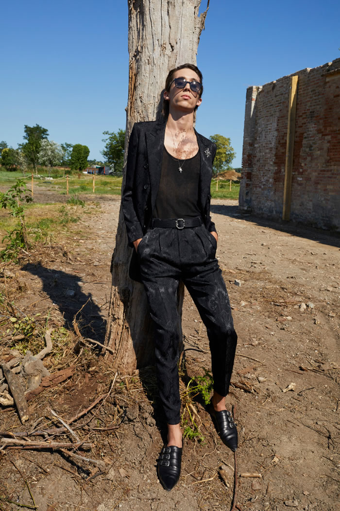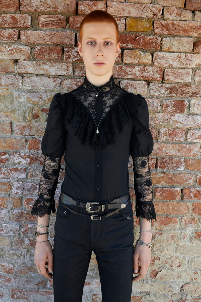 Rather than feeling vintage, the collection had a timeless appeal. The boundaries between feminine and masculine blurred, as did the lines between everyday pieces and occasion outfits, for a wardrobe designed for eccentric men who feel comfortable in frilled lace shirts, dramatic flowing silk capes matched with skinny pants and lace-up platform shoes, as well as in loose pirate sleeved blouses. Tailoring was enriched with details such as velvet inserts and delicate brooches.