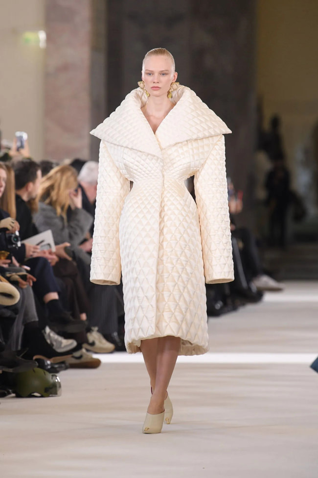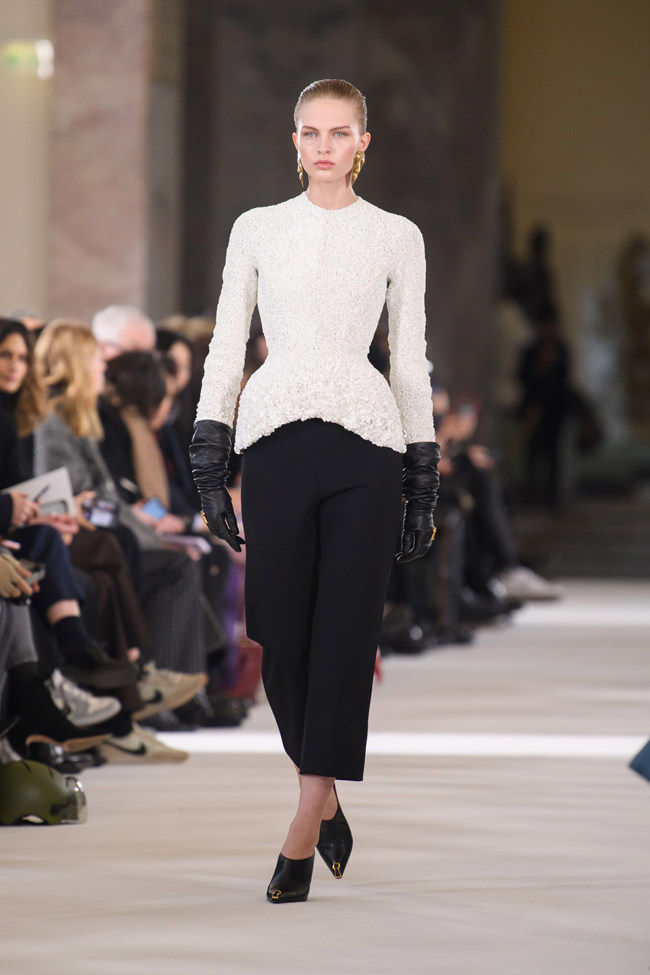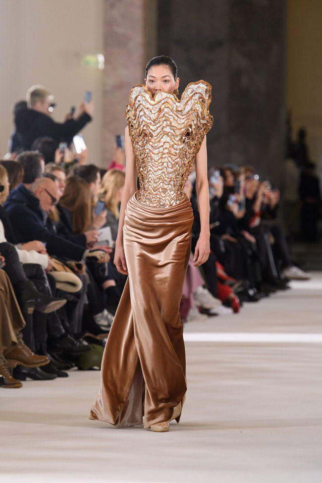 It’s a shame that all the explosive attention drawn by the three sinful animal symbols Dante wrote of (Lion: pride; Leopard: lust; Wolf: avarice) overshadowed the extraordinary work Roseberry and his team lavished on molding, sculpting, and embellishing the majority of the collection. The waisted shape of the classic Schiaparelli Shocking! The perfume bottle was transmuted into extreme hourglass silhouettes, corseted in the back. There were ‘plastrons’ of stiffly exaggerated, up-to-the-eyeliner bustiers (crafted in mother-of-pearl, marquetry, and broken glass jewelry).