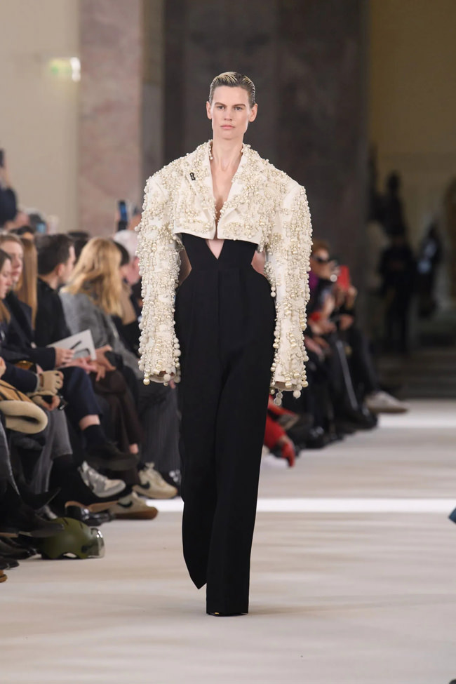 The fun and the spectacle of the pre-show parade of paying couture clients decked hat-to-molded-toe platforms in Schiaparelli black and gold, trompe l’oeil skeleton-embroidered jackets, and gilded body-part jewelry said that. Only to be upstaged by the entrance of Doja Cat, her face and head smothered in fiery crystals, with her red-clad entourage. “Oh!” quipped one riveted onlooker. “Do you think she’s come as the devil?”
