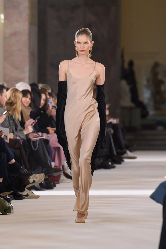 He also dealt out incredibly silhouetted trouser suits, vertiginously plunging tuxedos, and a pinstripe that had mind-boggling lines imitating menswear fabric, but curving in and out in some visually unaccountable way. “Putting women in menswear, but making the silhouette hyper-feminine,” as he phrased it.