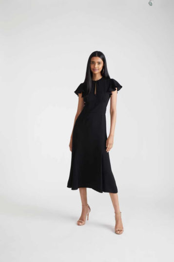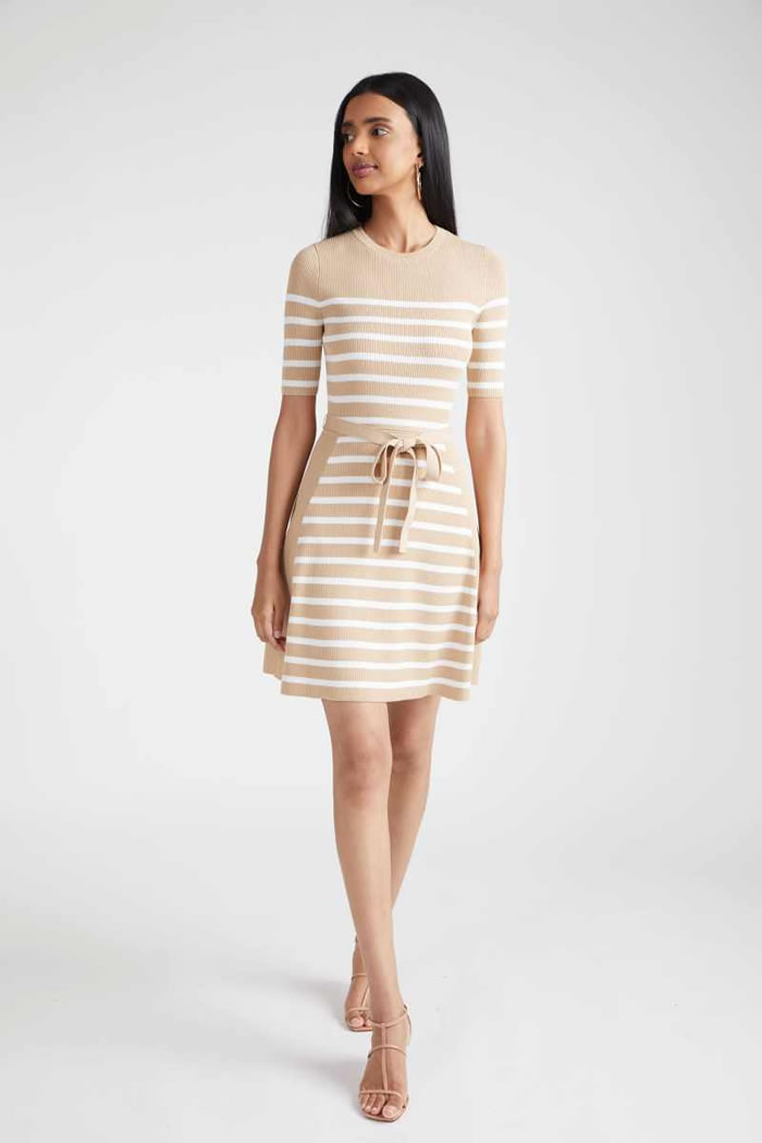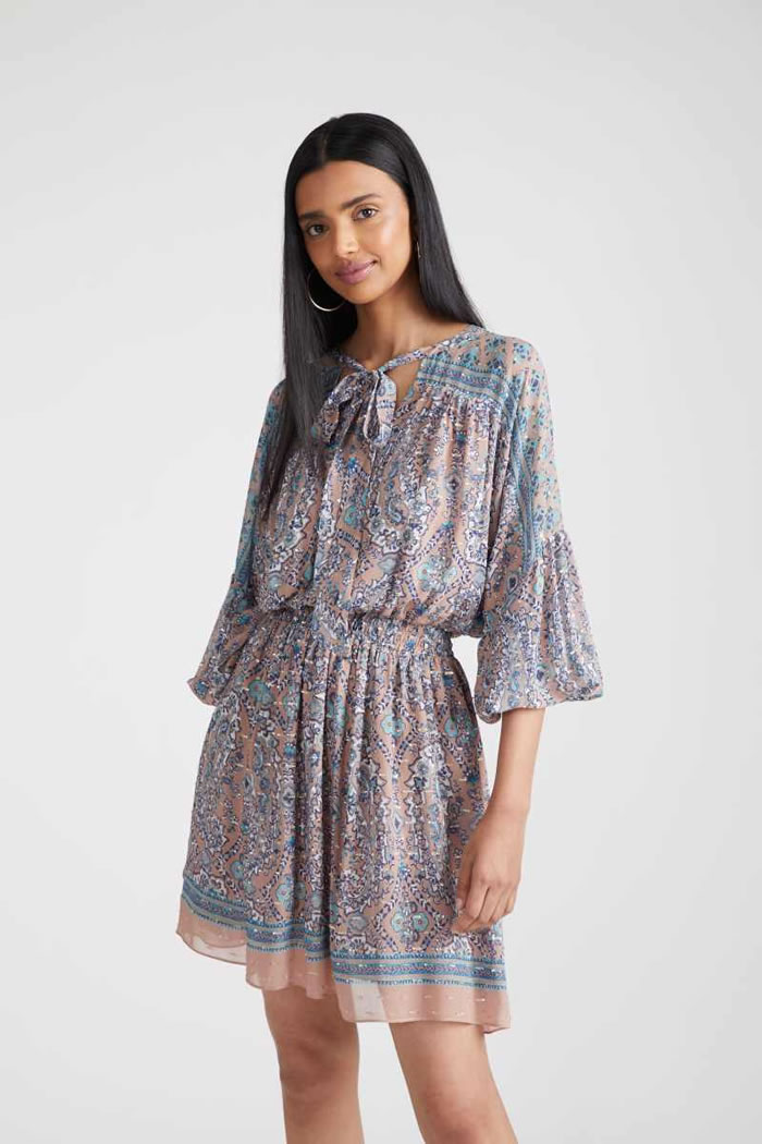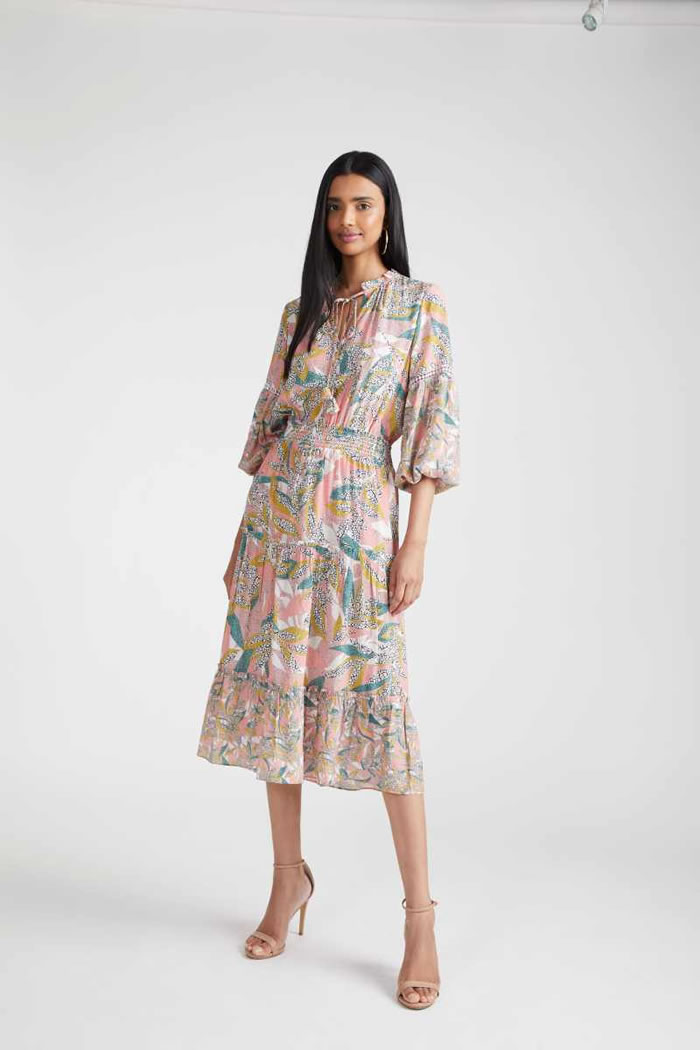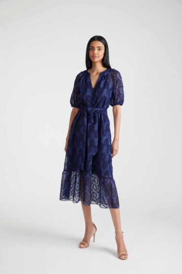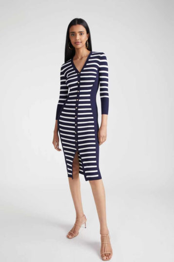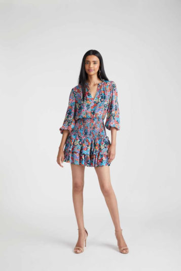 Designer Shoshanna had come across James Northfield’s ads for Australian vacation spots in the ’30s, ’40s, and ’50s, which formed a jumping-off point for vintage prints which came splashed across safari-style belted shirt dresses, joggers that tied at the ankle, and a scarf dress which featured a postcard print derived from tourist posters.