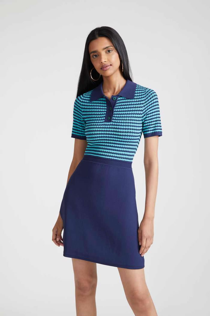 Designer Shoshanna had come across James Northfield’s ads for Australian vacation spots in the ’30s, ’40s, and ’50s, which formed a jumping-off point for vintage prints which came splashed across safari-style belted shirt dresses, joggers that tied at the ankle, and a scarf dress which featured a postcard print derived from tourist posters.