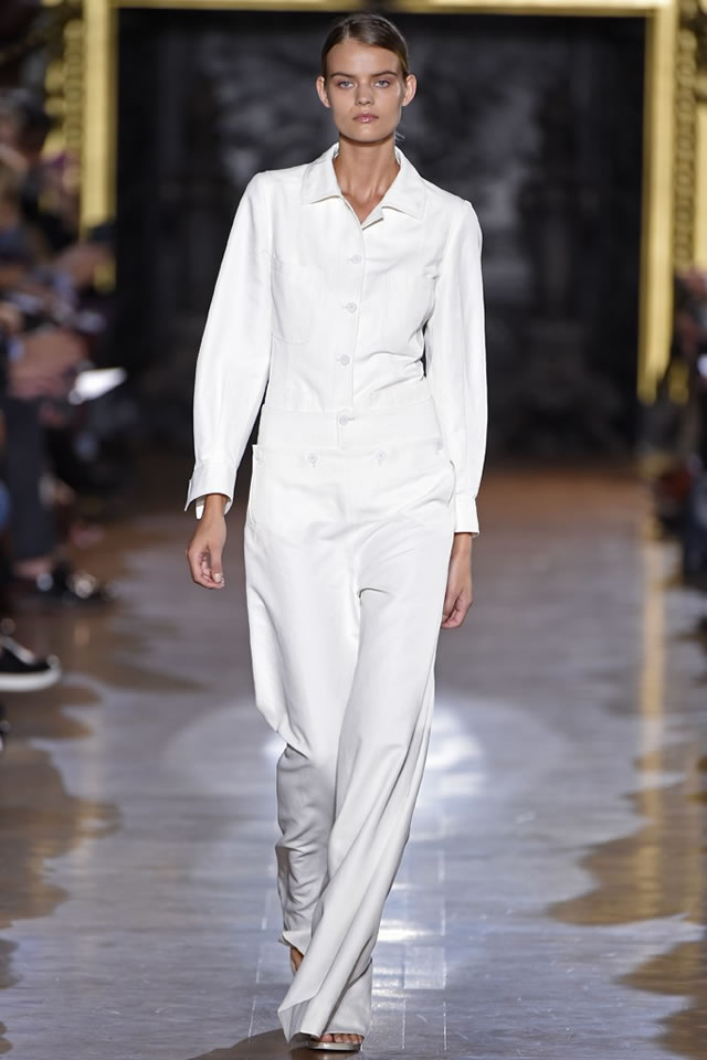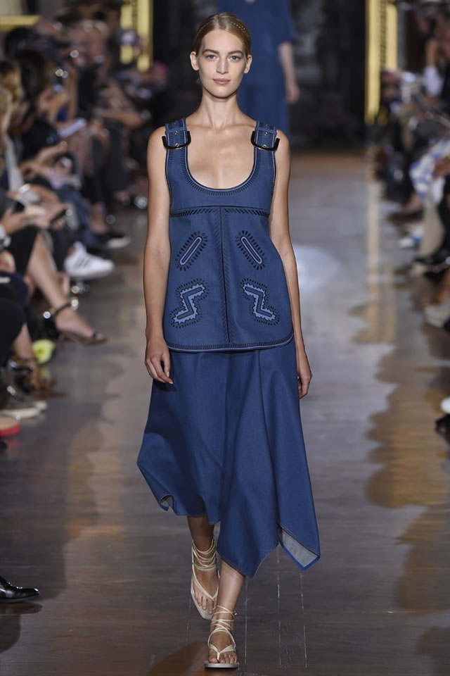 McCartney did her part for the denim craze with crisp looks dressed up just enough with asymmetric and graphic appliqués. Often, she added a touch of tough to the structure with big, demonstrative buckle closures.