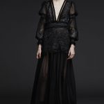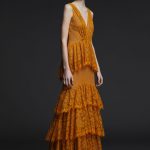 A stained-glass motif also provided a punch of bold floral prints and play on color combos. The strongest looks linked to these motifs included a black lace gown with sheer blouson sleeves, and a couple of poppy yellow dresses with an emphasis on the waist without being too corseted. The collection appeared to emphasize Shoji’s focus on driving a younger consumer. Flirty baby-doll dresses one in an airy pastel pink, another in a blue floral print with a deep V-neck screamed happy and young. Ruffle details and a bit of sensuality with cut-outs and sheer fabrics hammered that point home.
