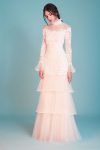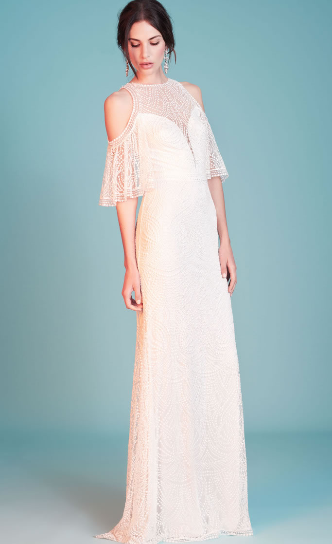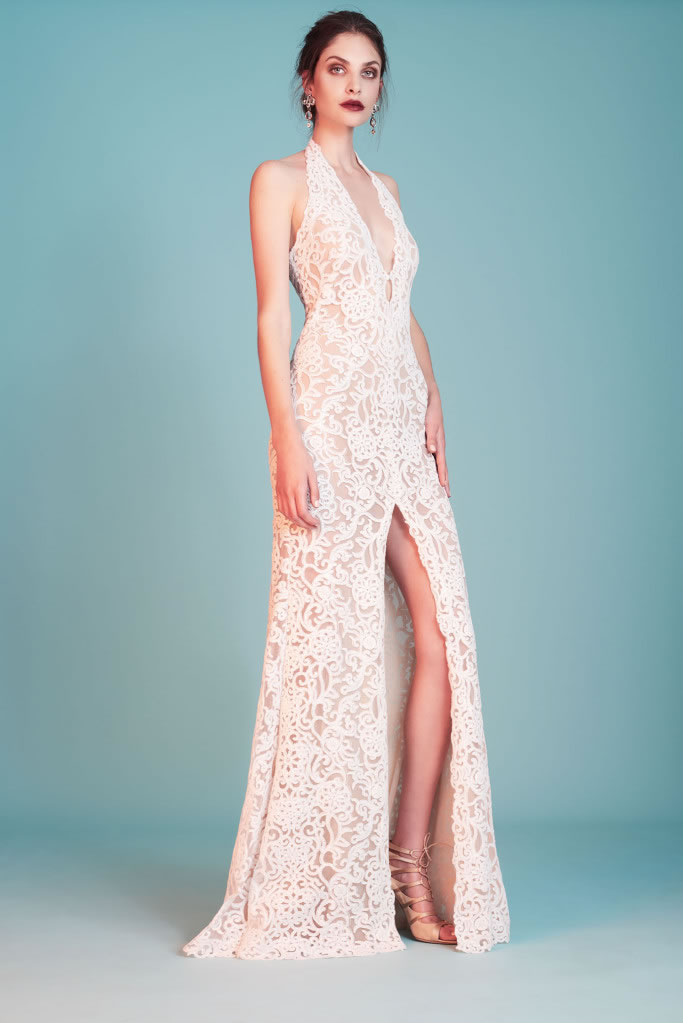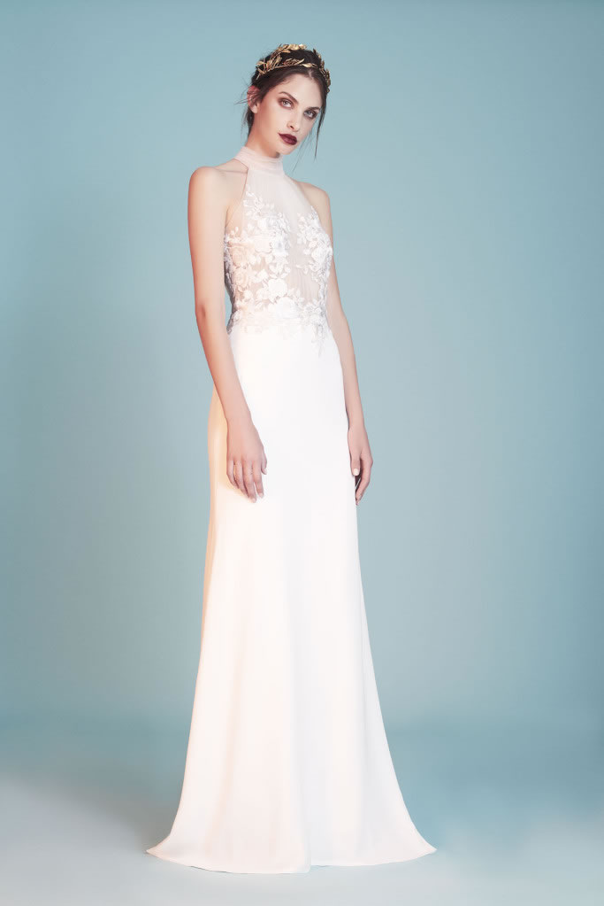 The collection draws from three iconic Hollywood figures: Grace Kelly for the classic, elegant bride with dresses that are focused on sleek shapes and clean lines. Marilyn Monroe was drawn upon for brides who want to accentuate their figures with cutouts, sheer panels and plunging neck lines. And finally, Mia Farrow-inspired looks that will resonate more with unconventional, less traditional brides who would rather go short, wear a jumpsuit, or play with separates.