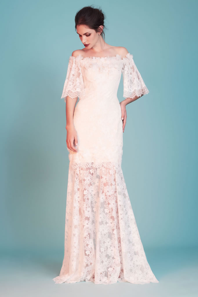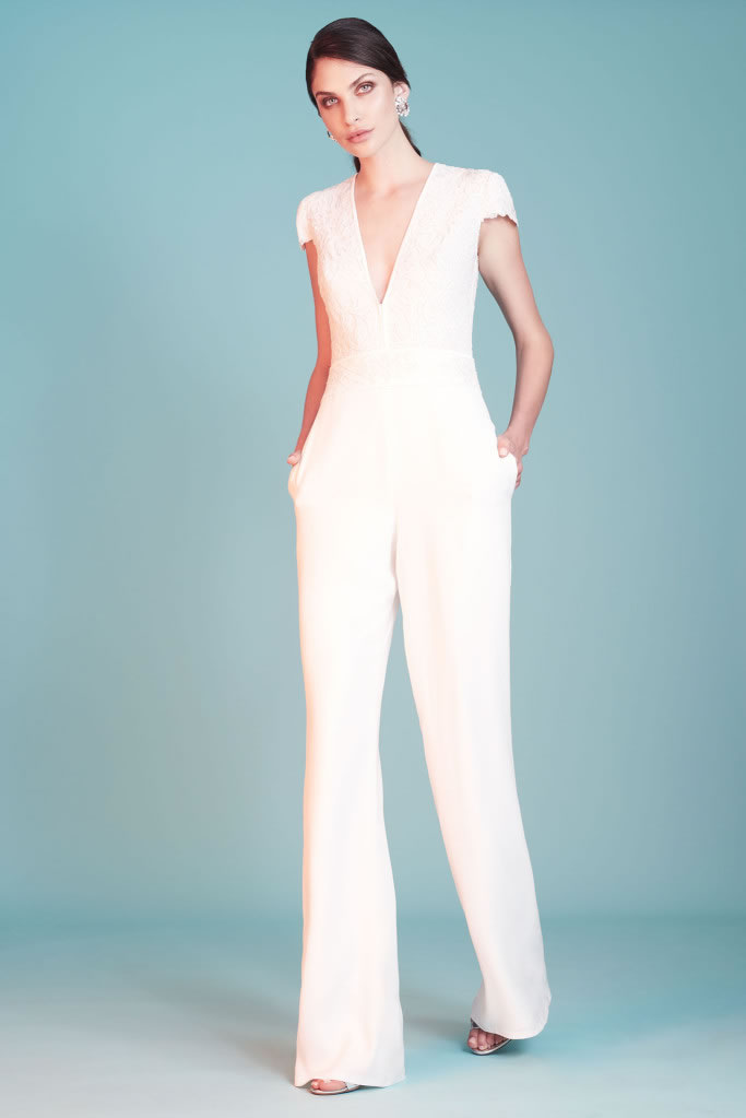 The collection draws from three iconic Hollywood figures: Grace Kelly for the classic, elegant bride with dresses that are focused on sleek shapes and clean lines. Marilyn Monroe was drawn upon for brides who want to accentuate their figures with cutouts, sheer panels and plunging neck lines. And finally, Mia Farrow-inspired looks that will resonate more with unconventional, less traditional brides who would rather go short, wear a jumpsuit, or play with separates.