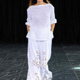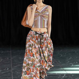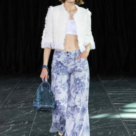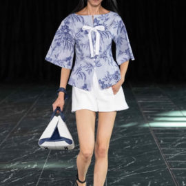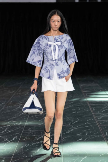 Boys were given crisp white-on-white versions with dual textures and collars that extended into belts and classic houndstooth patterns paired with Bermuda shorts. The recurring checked pattern paired well with the collection’s standout motif, a wallpaper-worthy chinoiserie print.